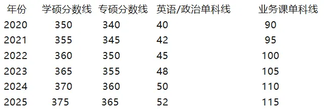 分析:①学硕分数线比专硕高5-10分,且单科线(尤其是英语)要求更严格。 ②业务课(如音乐史、和声曲式)分数线普遍较高,2024年达110分,对考生专业基础要求极高。③2025年分数线预估继续上涨,学硕可能突破375分,专硕365分。