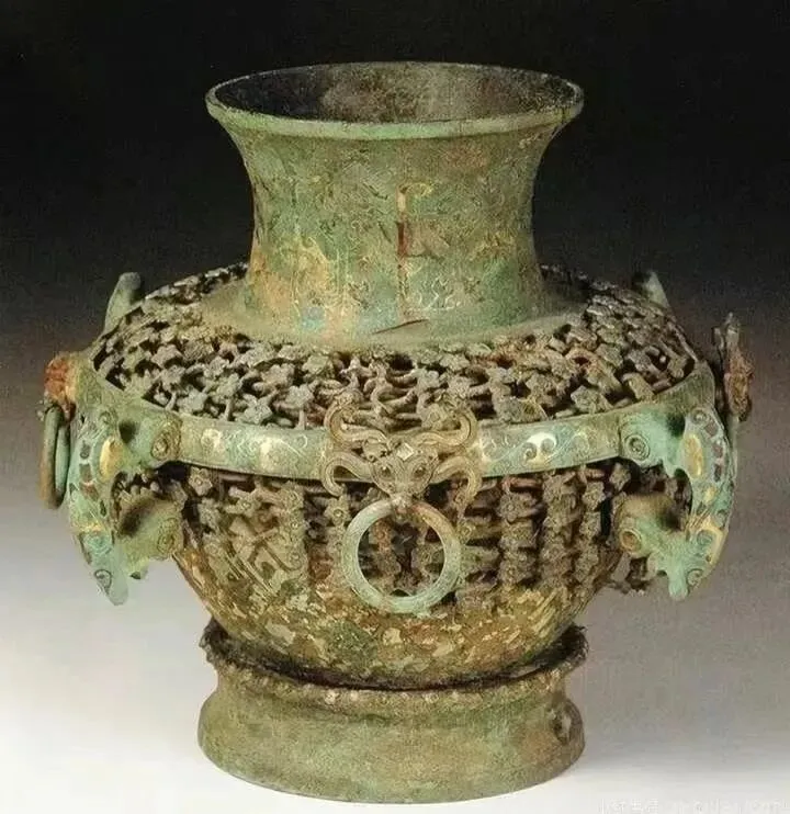 战国时期的容酒器,它的制作工艺极其复杂。圈足外刻有“陈璋伐匽(燕)之获”的铭文字样,所以又把它称为“陈璋圆壶”。