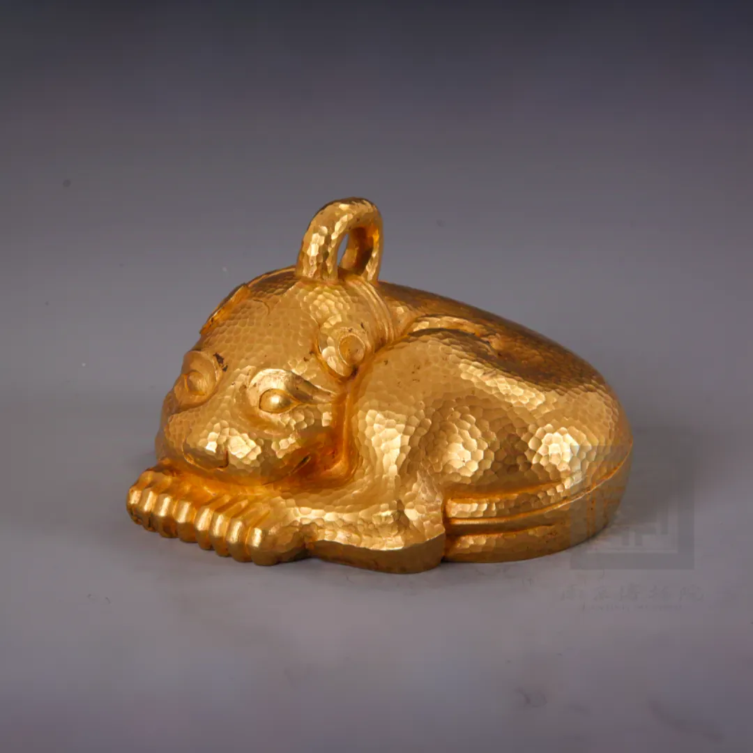1982年出土于江苏省盱眙县南窑庄窖藏。年代最晚可追溯至西汉。浇铸成形,通体锤饰圆形斑纹。腹内部刻有“黄六”二字。金兽含金量99%,重9100克,是目前我国出土古代黄金铸器中最重的一件,被称为“镇护之宝”。