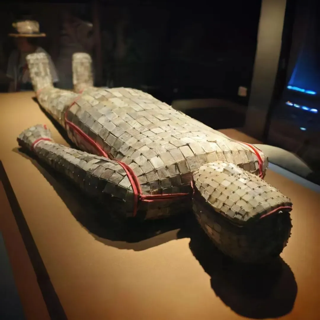 西汉江都王刘非王后墓出土。金缕玉衣是汉代最高规格的丧葬礼服,通常只有皇帝、诸侯王及极少数近臣才能使用。南博还有一件银缕玉衣,两件经常轮番展出。