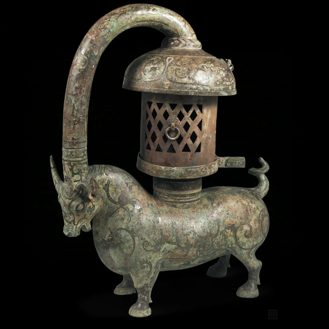东汉时期的青铜器。由灯座、灯盏和烟管三部分组成,采用错金银工艺装饰,纹饰包括流云纹、三角纹、螺旋纹等,并饰有龙、凤、虎、鹿等图案。灯具设计巧妙,具有实用性和艺术性相结合的特点,是汉代青铜灯具中的精品。