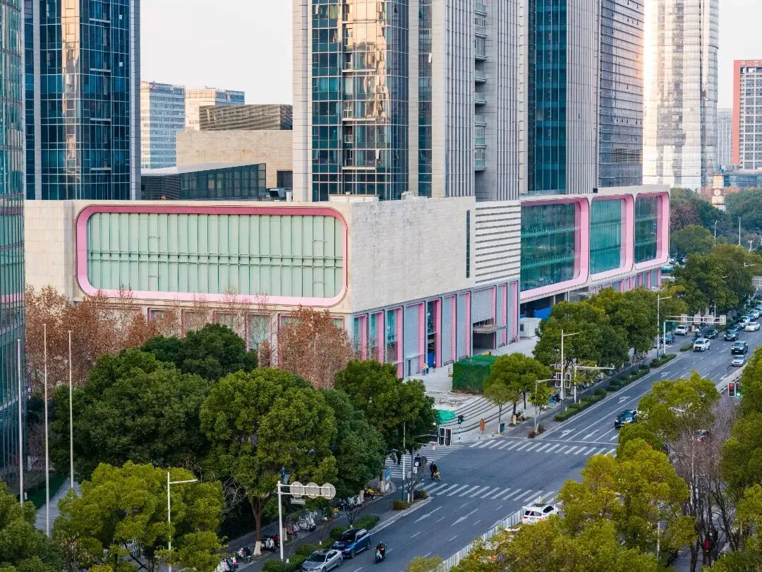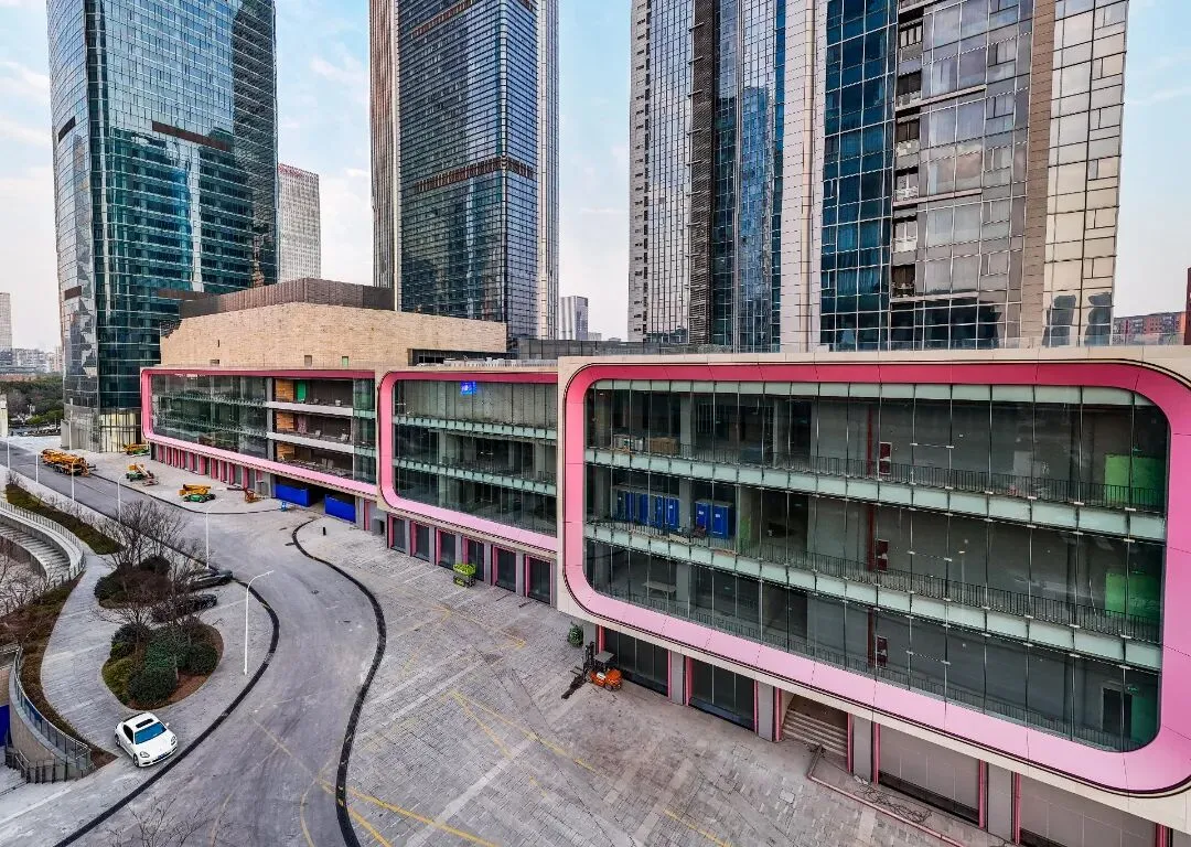 近日,位于河西元通商圈的德基时刻,正加紧完成装修工作。在现场可以看到,商场玻璃幕墙已基本安装完毕,内部装修全面展开,外立面一抹亮眼的粉色装饰尤为引人注目。