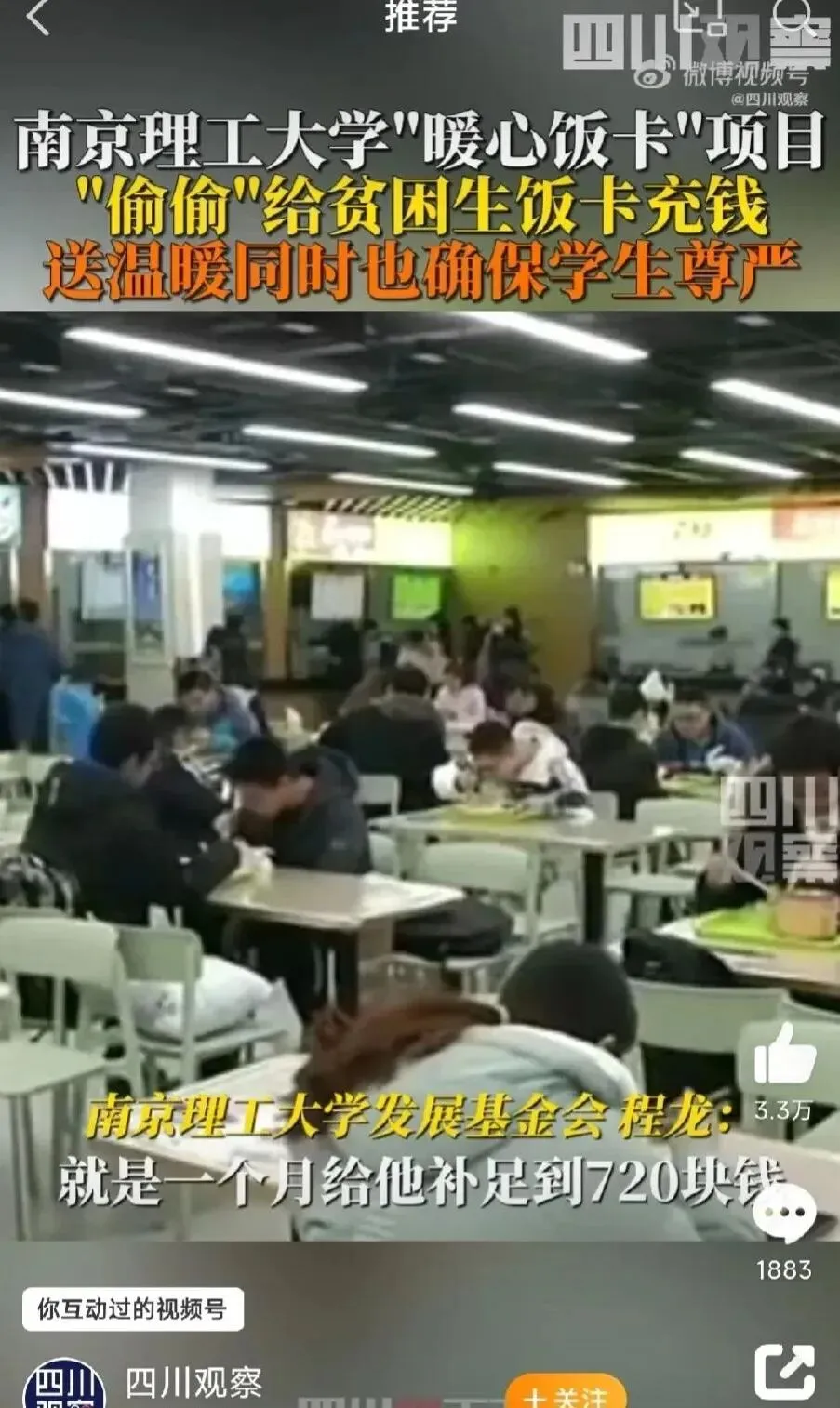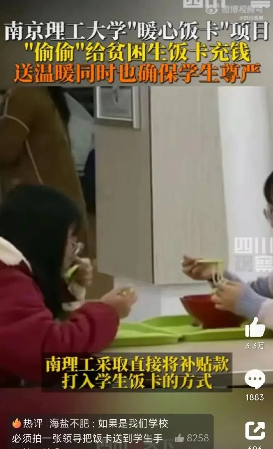 南京理工大学校长在食堂打饭时的一次偶遇,看到了一个学生窘迫的晚餐。为此这位校长不走长规路,删除了帮扶的流程。隐性的把钱打在了他们的饭卡里,为贫困学生留住了体面,保护了他们的尊严。