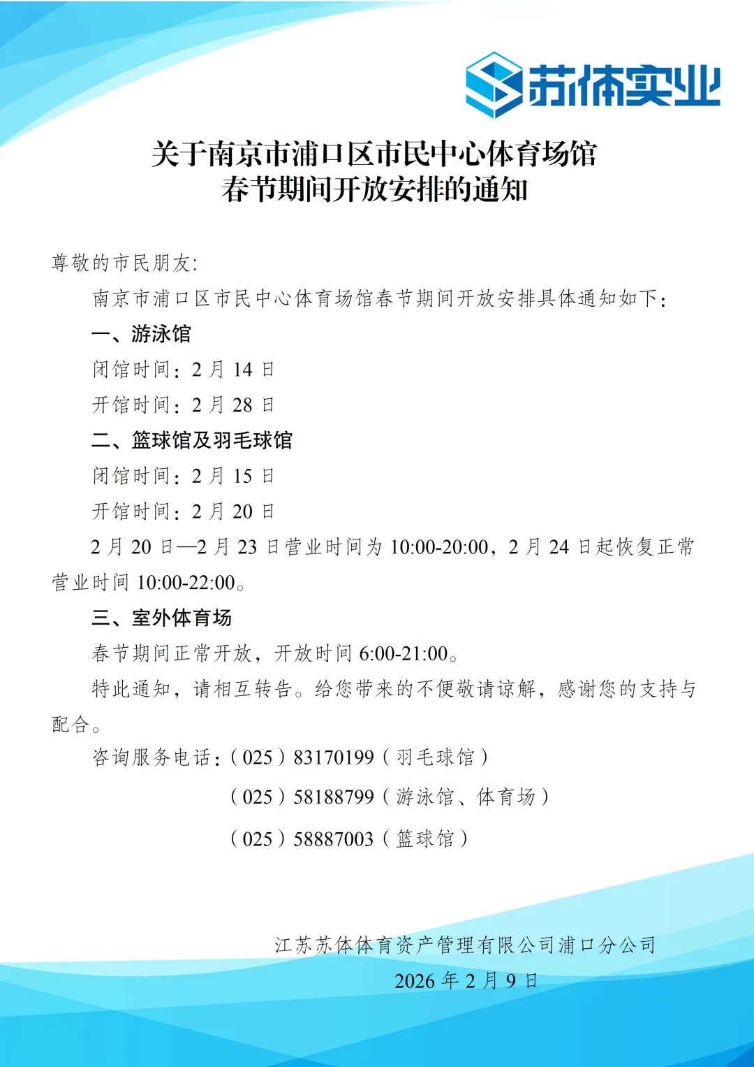 关于南京市浦口区市民中心体育场馆春节期间开放安排的通知