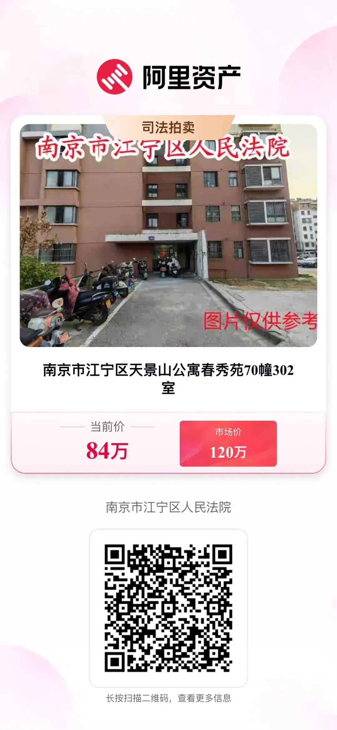拍卖对象:南京市江宁区天景山公寓春秀苑70幢302室,证载建筑面积108.75平方米,证载套内建筑面积86.34平方米。所在建筑物总层数为19层,拍卖对象位于第3层,建筑年代约为2013年。【详细信息请查看《不动产登记资料查询结果证明》】