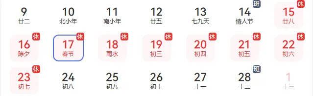 自2026年2月15日(周日)至2026年2月23日(周一)放假,共9天,2月14日(周六)、2月28日(周六)正常上班。
