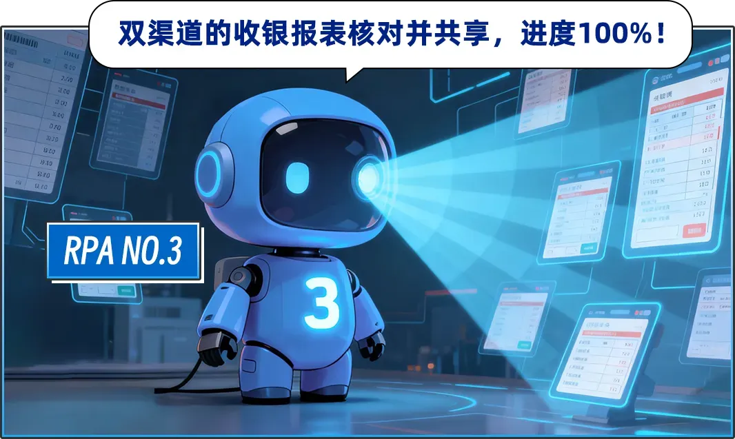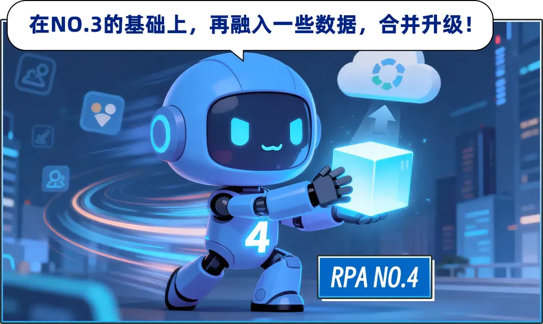 第四期:进一步升级,在第三期的基础上将原来商户交易流水的人工多渠道下载合并工作交由RPA机器人完成,实现跨系统数据聚。