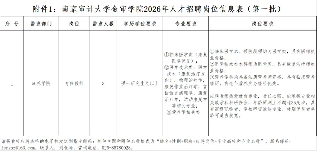 2、报名方式:应聘人员填写《南京审计大学金审学院招聘报名表》(见附件2),并将报名表格通过附件以word格式发送至联系邮箱。邮件主题和附件名称格式规范统一写成“姓名+性别+职称+应聘岗位+毕业高校和专业名称”,联系邮箱: jsrssz@163.com,联系人:刘老师,联系电话:025-85780028。