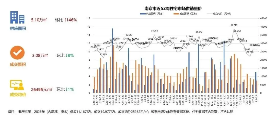 本周住宅市场供应5.32万㎡,环比上涨146,成交3.23万㎡,环比下滑8% ,成交均价26664元/㎡,环比下滑1% 。