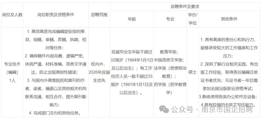 声明:“南京市国企招聘”公众号刊载此文,旨在公益性分享传递更多信息并无盈利性质使用,招聘信息皆来源于网络招聘平台。若信息来源标注错误或侵犯了您的合法权益,请及时联系我们,我们将立即删除或改正。