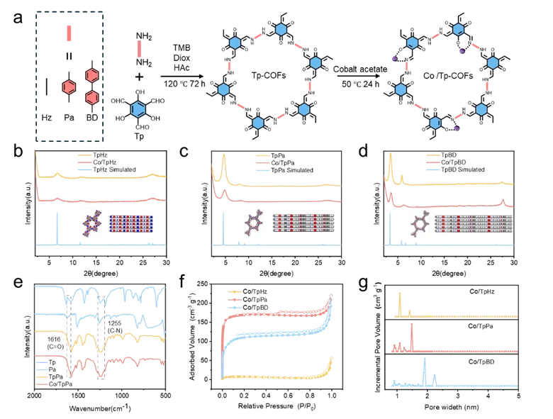 共价有机框架以其结构可预测、孔道可设计、易于功能化等优点,成为固定单原子和构建定制化微环境的理想平台。本研究巧妙选用三种氨基连接体——联氨、对苯二胺、联苯二胺,与1,3,5-三甲酰基间苯三酚缩合,构建了β-酮胺连接的COFsTpHz TpPa TpBD)。连接体中苯环数量(0 1 2)的系统变化,直接改变了骨架的π共轭程度,从而在锚定的钴单原子周围形成了具有差异化电子性质的第二配位壳层。