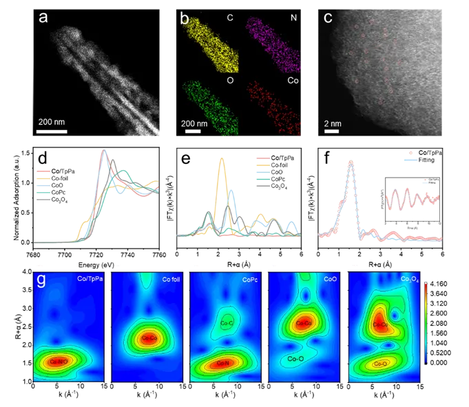 Figure 2. (a) The TEM image, (b) EDS spectra and (c) AC-HAADF-STEM image of Co/TpPa. (d) Normalized XANES survey spectra at the Co K-edge of Co foil, CoO, Co3O4, CoPc and Co/TpPa. (e) k3-weighted Fourier-transform Co K-edge EXAFS spectra of the samples. (f) Co K-edge EXAFS fitting curves of the Co/TpPa catalyst in the R space, respectively. (g) Wavelet-transformed k3-weighted EXAFS spectra of Co foil, CoO, Co3O4, CoPc and Co/TpPa.