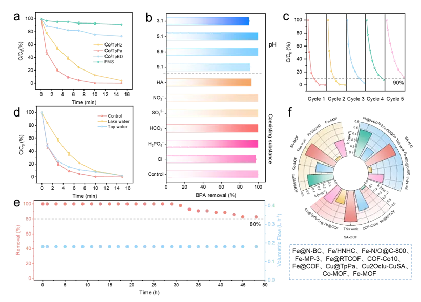 Figure 3. (a) Degradation of BPA in different catalytic systems. (b) Degradation efficiency in different water qualities. (c) The cyclic and regenerative properties of Co/TpPa system for BPA removal. (d) Continuous operation test of BPA removal efficiency in the continuous flow system. (f) Comparison of pollutant removal efficiencies of Co/TpPa with other recently reported catalysts vs PMS dosage. Reaction condition: [Catalyst] = 0.15 g L−1, [PMS] = 0.30 g L−1, [Pollutants] = 20 mg L−1, [Anions] = 5 mM, [HA] = 10 mg L−1, and initial pH = 7.0 ±0.2.