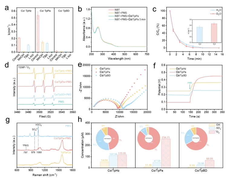 Figure 4. (a) Influence of different quenchers on Co/Tp-COFs system reaction rate constants k. (b) Time-resolved absorption spectra of NBT in Co/TpPa activated PMS system. (c) Degradation of BPA by Co/TpPa system in D2O with the k values (insert). (d) EPR spectra of TEMP-1O2. (e) Electrochemical impedance and (f) Open-circuit potential spectroscopy of Co/Tp-COF. (g) In situ Raman spectroscopy for the Co/TpPa systems. (h) Different ROS yields and (insert) contributions in Tp-COF/Co systems.