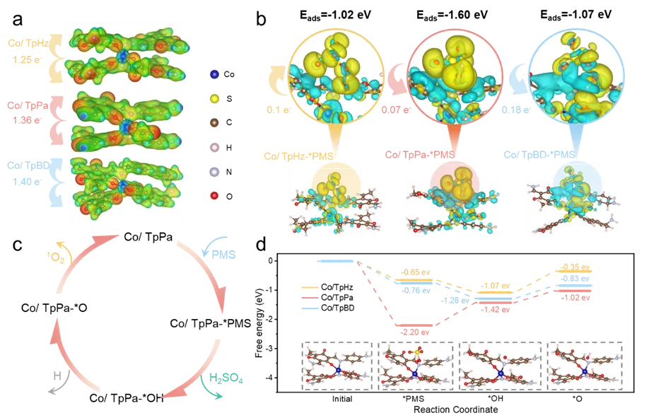 Figure 5. (a) The electrostatic distribution map of Tp-COFs. (b) The relevant adsorption energy and electrons transfer after PMS adsorption. (c) Possible mechanism step diagram of 1O2 generation by PMS activation. (d) Energy profiles of 1O2 formation for Co/Tp-COFs -PMS systems.