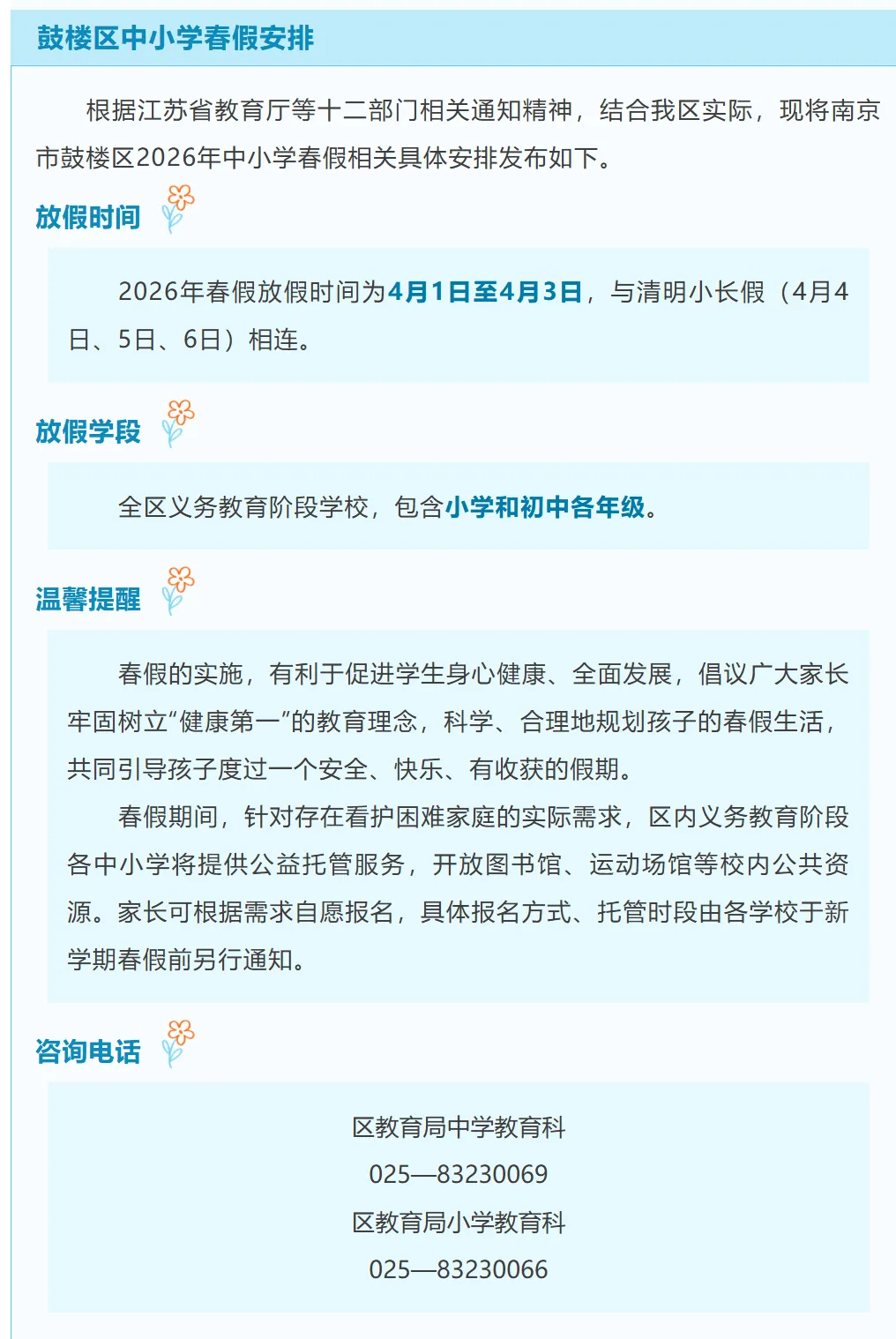 现结合建邺区实际情况,2026年春假工作安排如下: