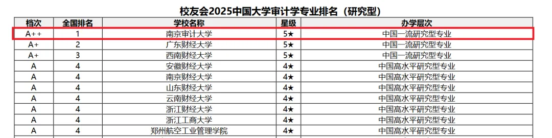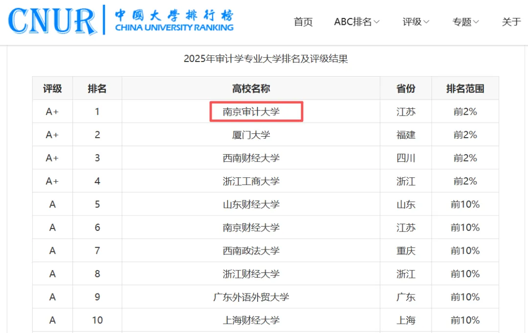 中国大学排行榜发布的《2025年ABC中国大学专业排名:审计学》中,南京审计大学被评为A+,同时排名全国第一。