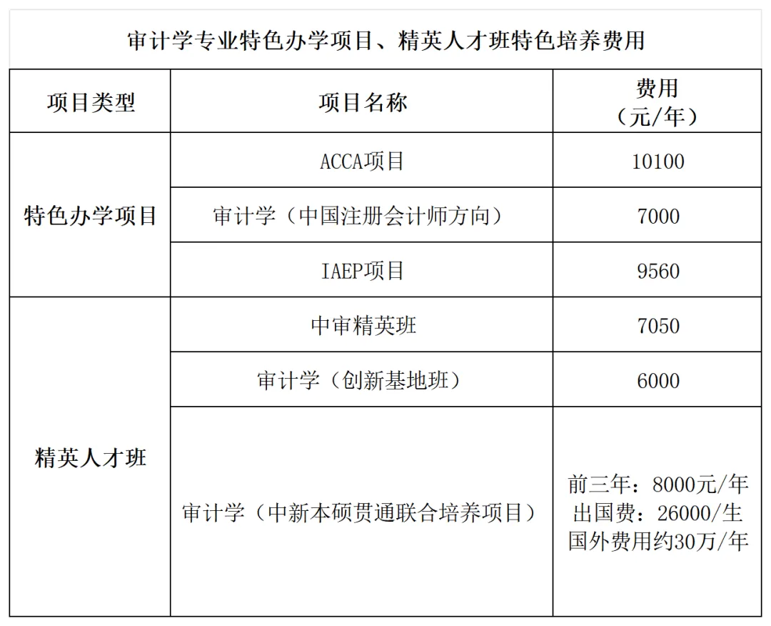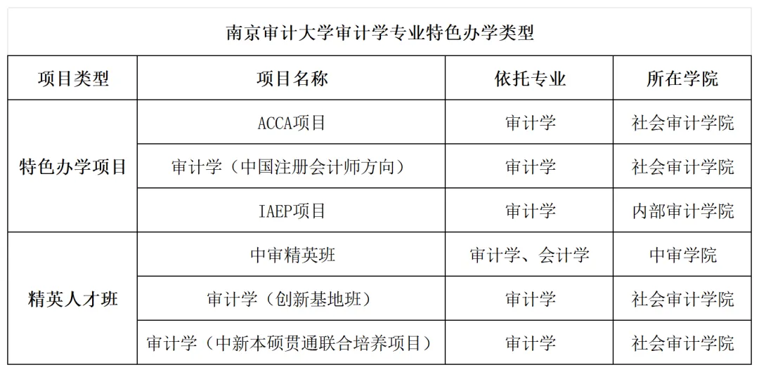 所以,如果学生的分数不能直接被南京审计大学的审计学专业录取,也可以选择南京审计大学的其他普通专业(注;非中外合作办学、定向招录等专业),入学后再通过特色办学项目和精英人才班选拔进入到审计学专业。