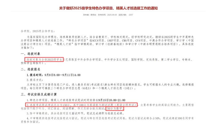 选拔时只有中审菁英班是笔试+面试,其余特色项目只需要笔试,笔试满分150分,只考英语和数学,英语为100分,数学为50分。