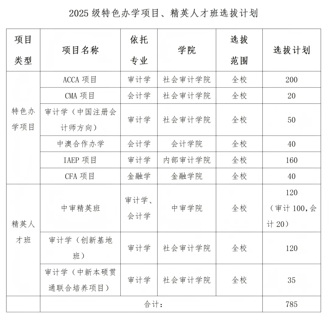 同时选拔人数也比较多。2025级特色办学项目和精英人才班一共选拔785人,其中审计学专业相关办学项目和精英人才班选拔了665人,占到南京审计大学2025级新生的近15%(南京审计大学2025级共招收新生4570人)。