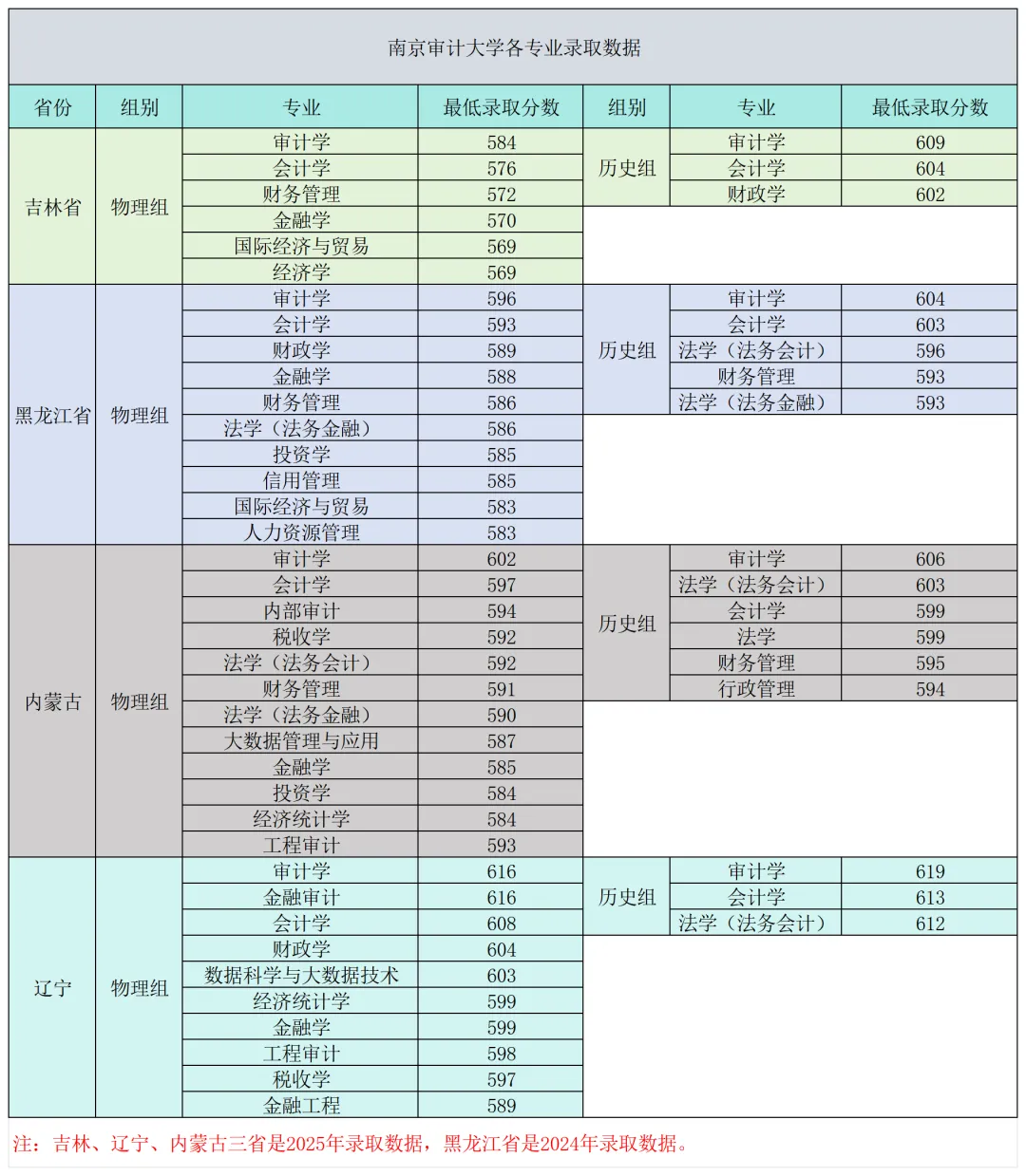 我整理了南京审计大学在黑、吉、辽、蒙四省的录取数据↓