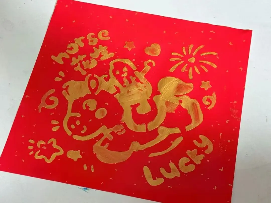 “看我印的小金马!”“我的是福字!”孩子们兴奋地展示着自己的作品。红纸金墨不仅承载着新春的祝福,更成为了亲子协作的温馨见证,现场弥漫着淡淡的墨香与浓浓的亲情。