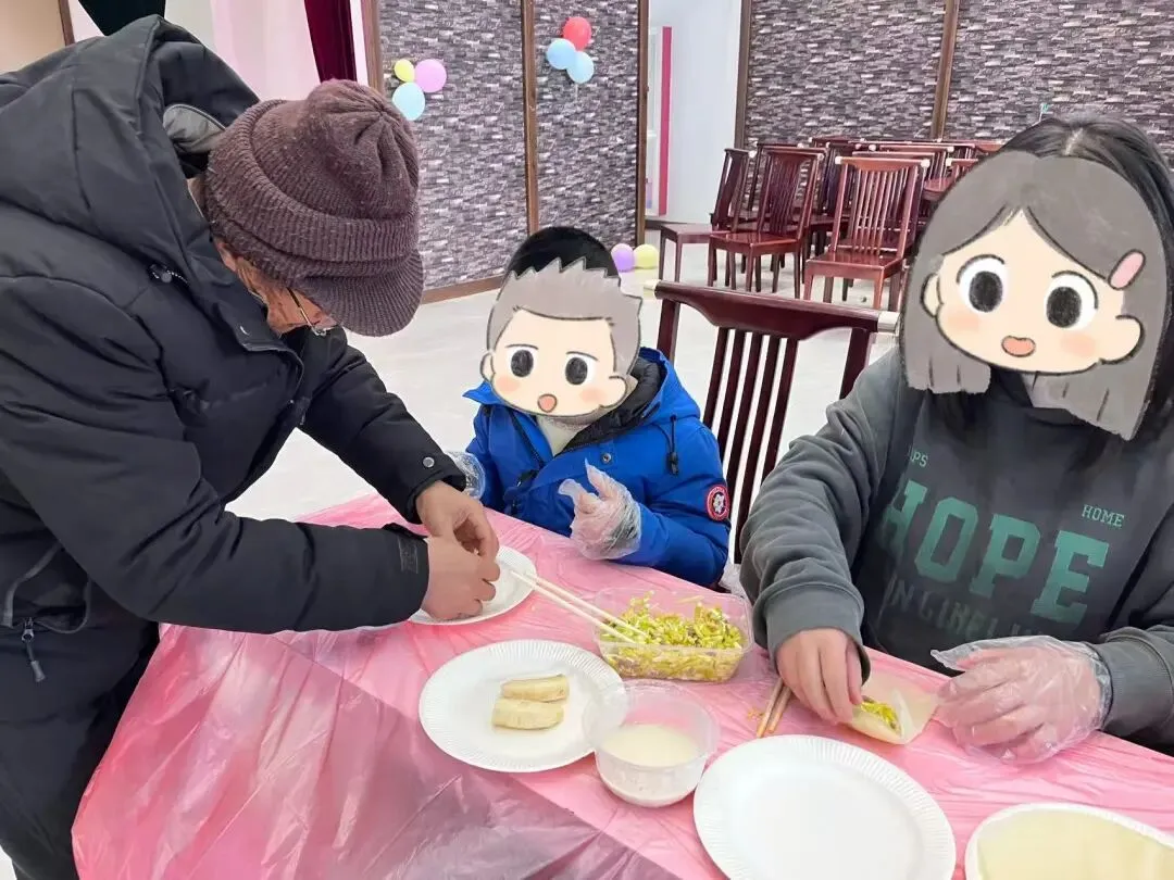 杨伟老师讲解“咬春”习俗的文化寓意,并演示制作方法。随后各组家庭领取食材,亲子配合完成春卷包制,并由家长志愿者现场烹制,共同品尝劳动成果。