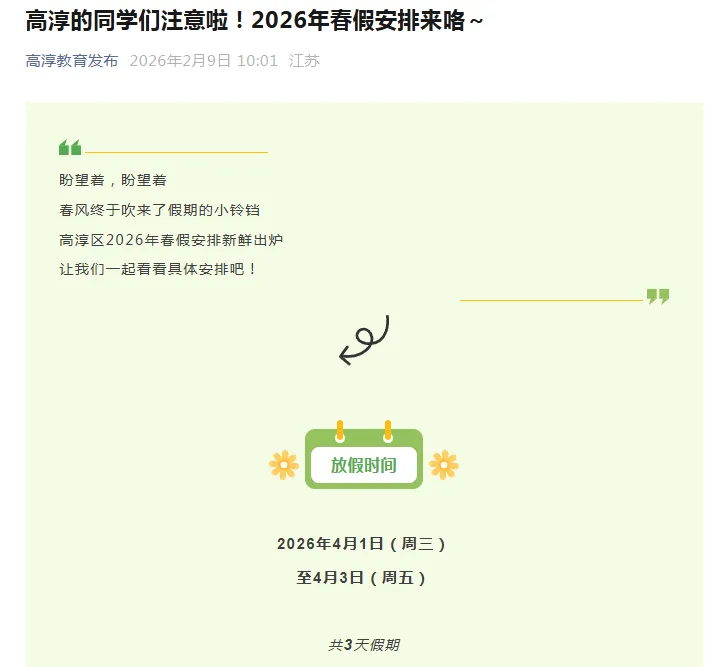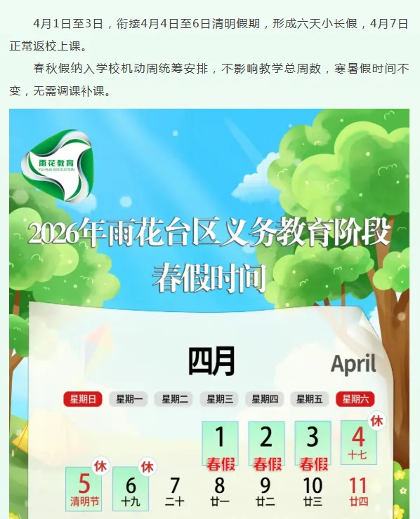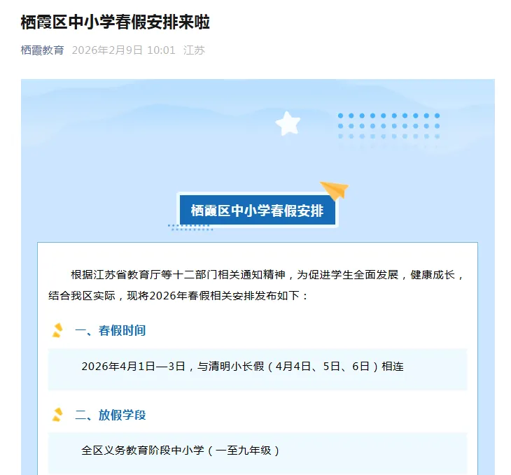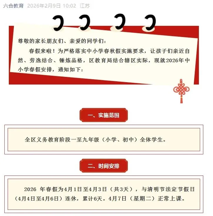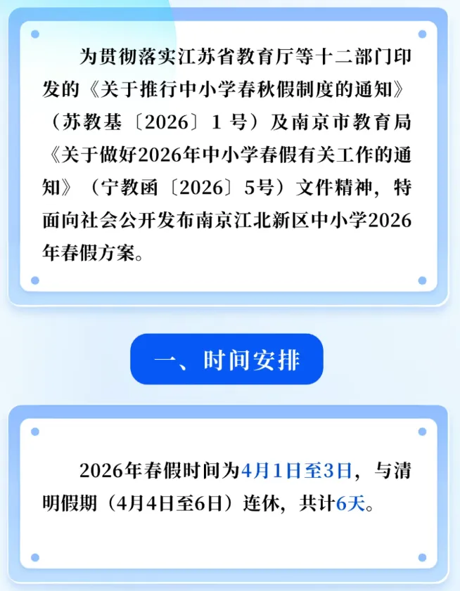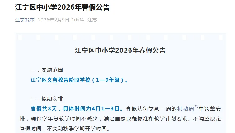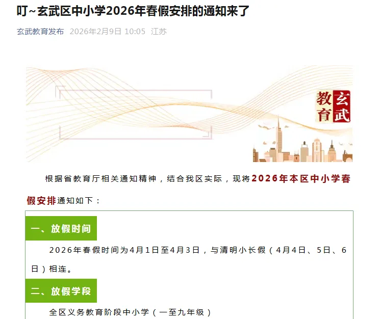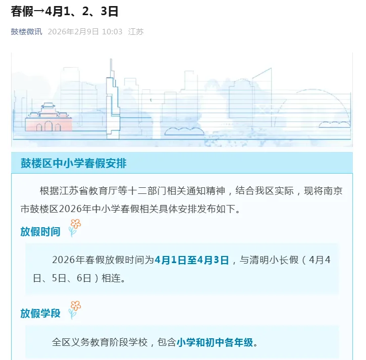 2月9日,南京市鼓楼区、玄武区、秦淮区、雨花台区、建邺区、栖霞区、溧水区、江宁区、江北新区、高淳区、六合区陆续发布2026年中小学生春假放假时间,为4月1日至4月3日,与清明小长假(4月4日、5日、6日)相连。