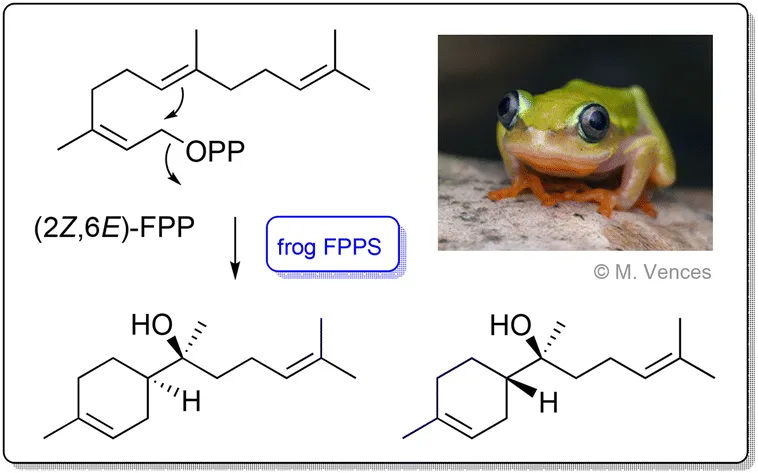 Org. Biomol. Chem., 2025, 23, 7940-7945 https://doi.org/10.1039/D5OB01139F本研究发现蛙类的法呢基焦磷酸合酶 (farnesyl pyrophosphate synthase, FPPS) 同源物能够催化 (2Z,6E)-FPP 发生意想不到的环化反应,生成双环倍半萜类化合物,从而揭示出多种 FPPS 酶所具有的一种潜在能力。该发现拓展了我们对高等动物萜类生物合成的理解,并启发了关于酶进化、底物混杂性以及挥发性信号分子生理意义等基础性问题。