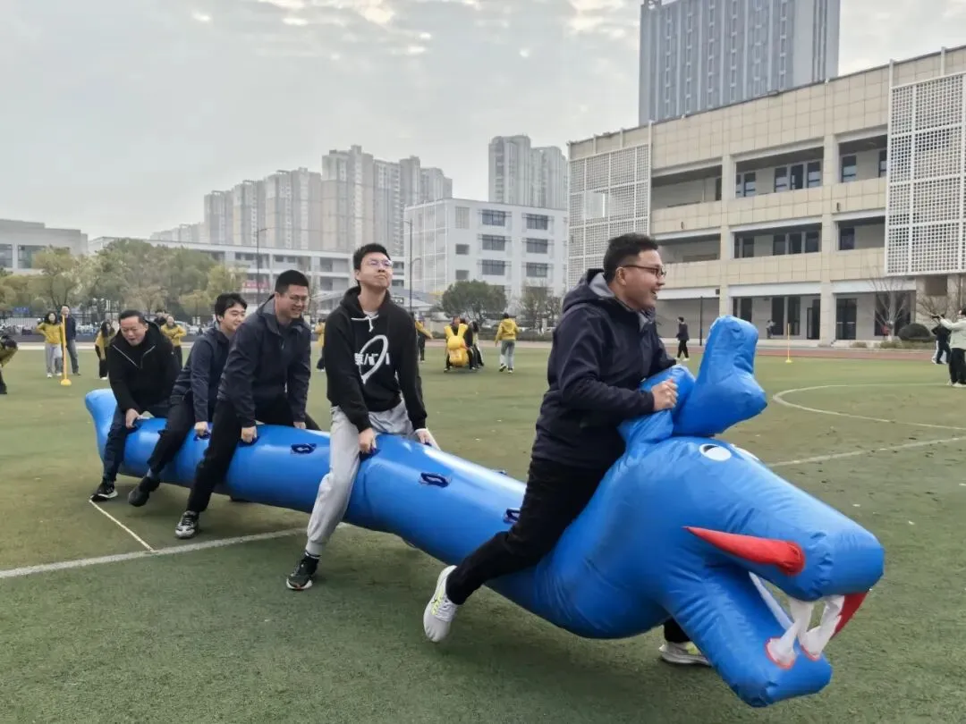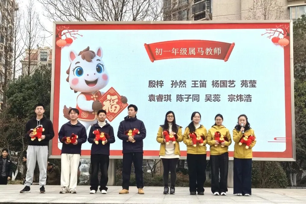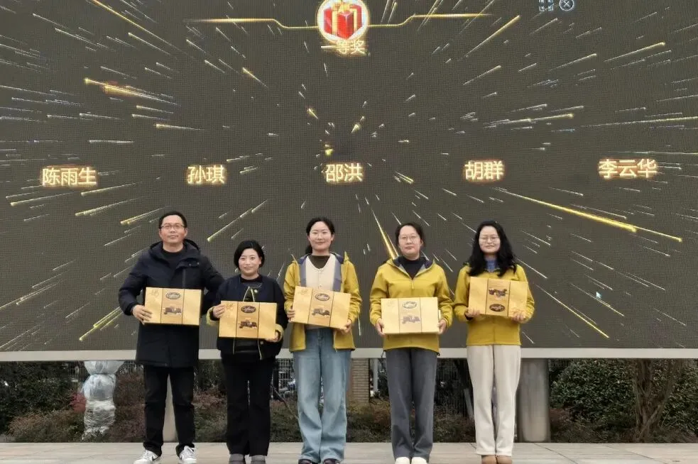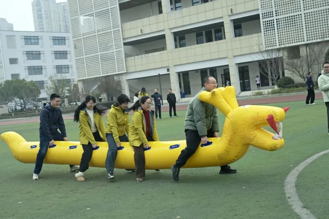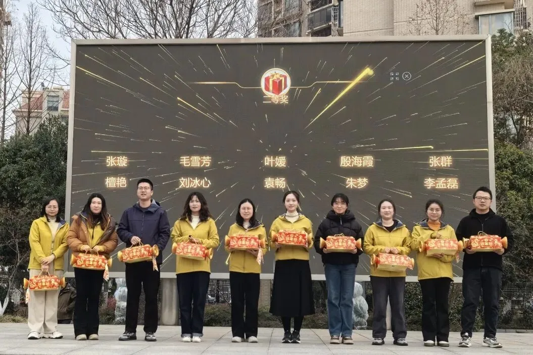 首项活动“一马当先·旱地龙舟赛”率先点燃赛场热情。各年级组组成的“龙舟”队伍齐心协力,步调一致,在“旱地”上奋力“划行”,争相竞渡,生动诠释了速度与协作的完美结合。赛后,初一年级属马的8位教师代表为大家送上了真挚的新年祝福。紧接着进行了第一轮抽奖,20位幸运的教职工喜获二等奖,将现场气氛推向一个小高潮。