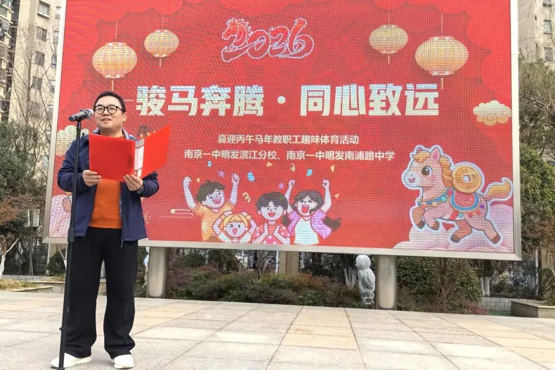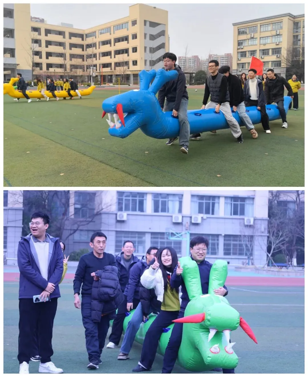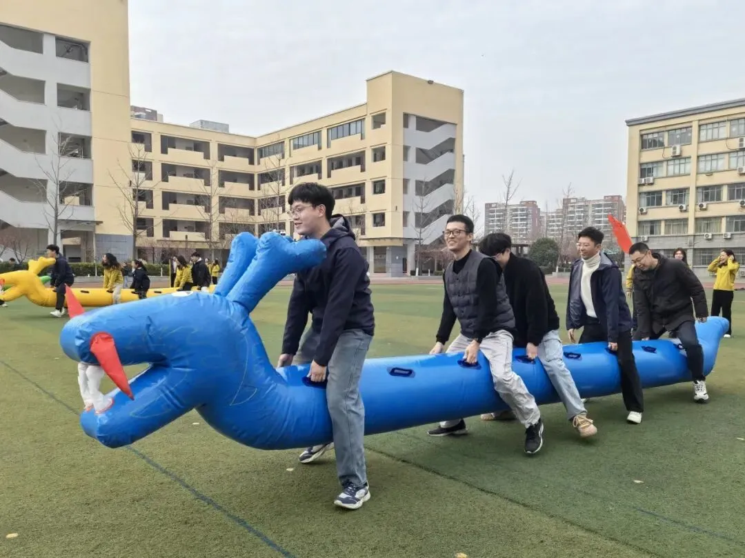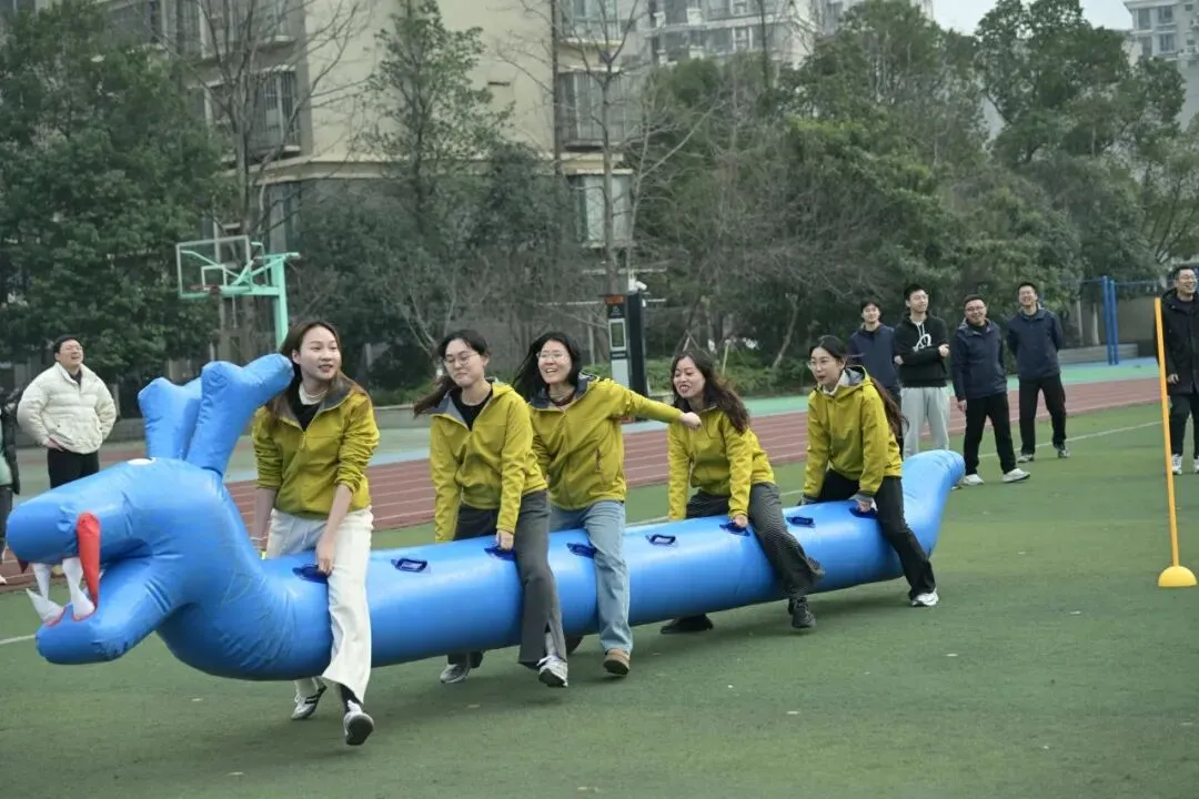 首项活动“一马当先·旱地龙舟赛”率先点燃赛场热情。各年级组组成的“龙舟”队伍齐心协力,步调一致,在“旱地”上奋力“划行”,争相竞渡,生动诠释了速度与协作的完美结合。赛后,初一年级属马的8位教师代表为大家送上了真挚的新年祝福。紧接着进行了第一轮抽奖,20位幸运的教职工喜获二等奖,将现场气氛推向一个小高潮。