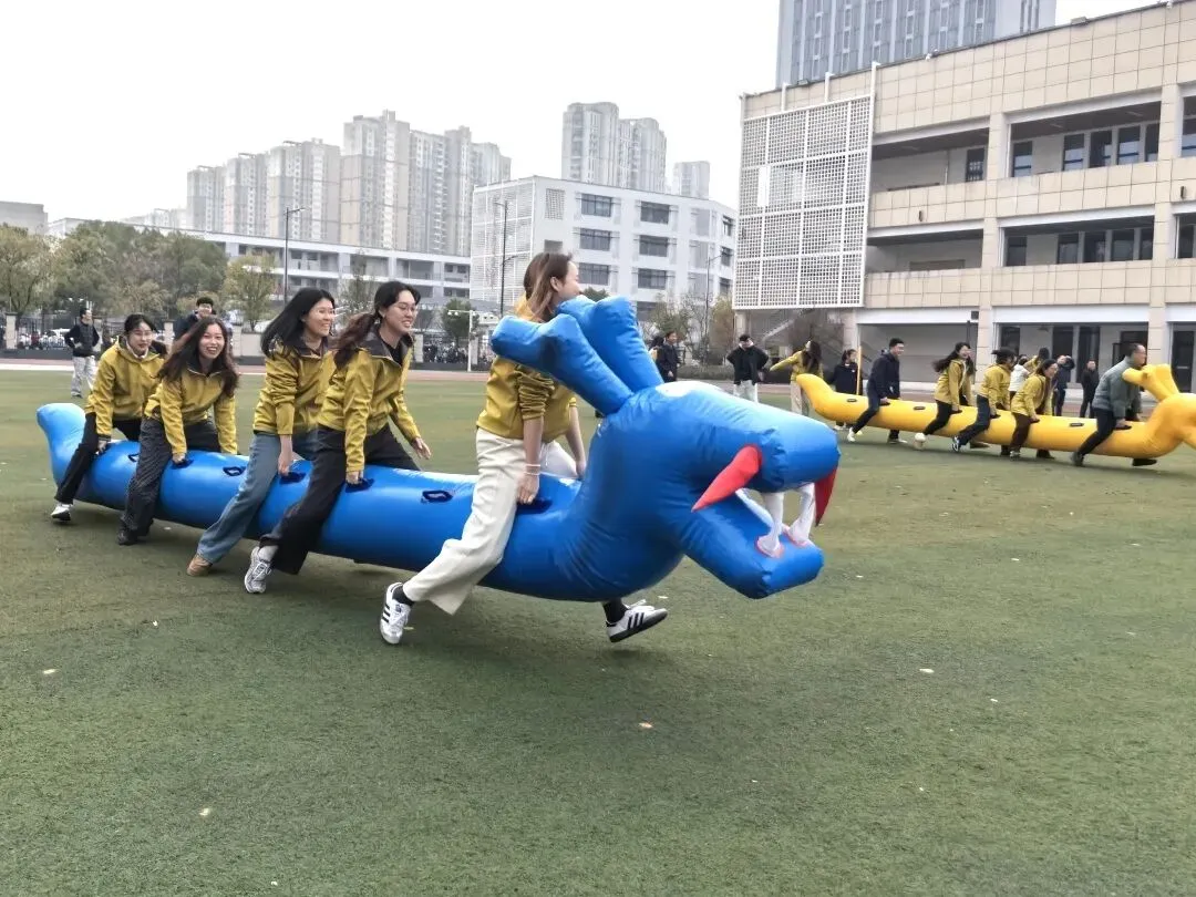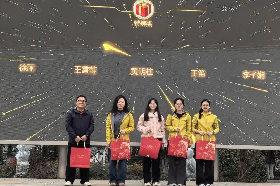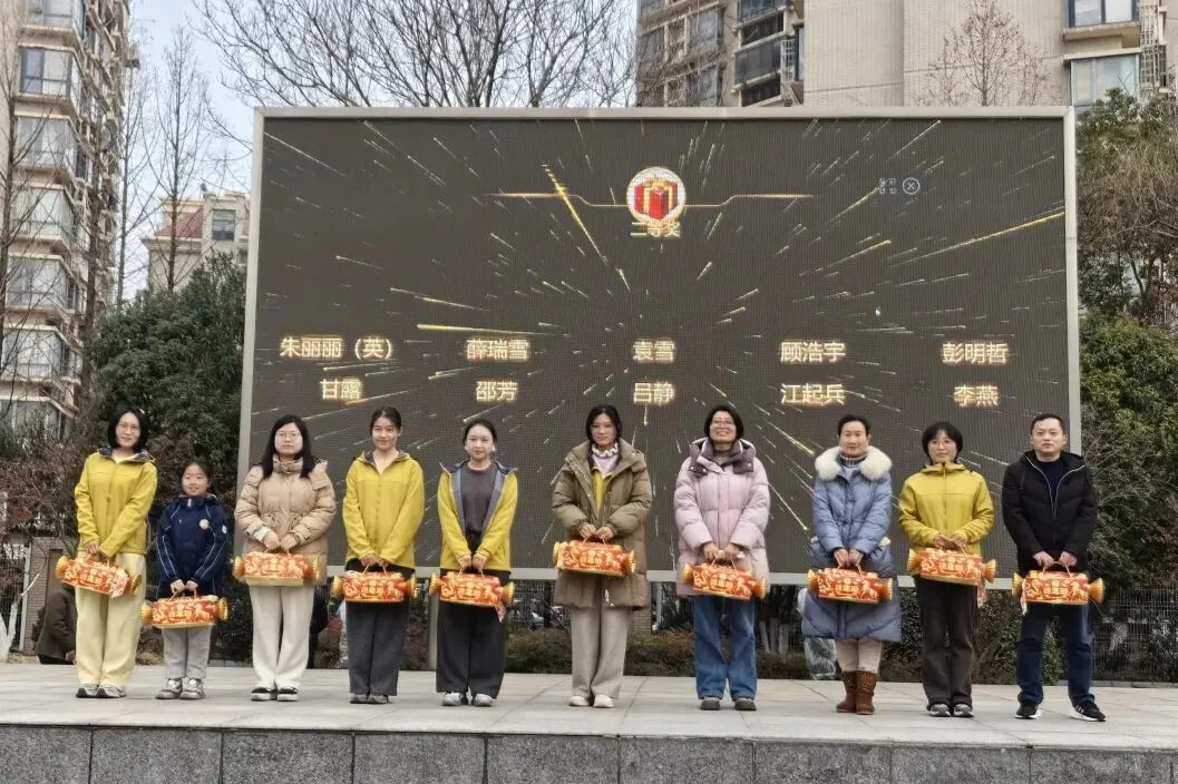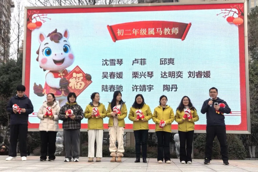 随后进行的“龙马精神·夹球接力赛”更是妙趣横生。队员们两两配合,用身体夹住气球进行接力,既要保证速度,又要防止气球掉落或破裂。比赛过程紧张激烈又笑点频出,充分考验了老师们的默契与技巧。随后,初二年级12位属马的教师登台传递了新年的期盼。激动人心的第二轮抽奖揭晓了10名一等奖获得者,引来阵阵羡慕与祝贺。