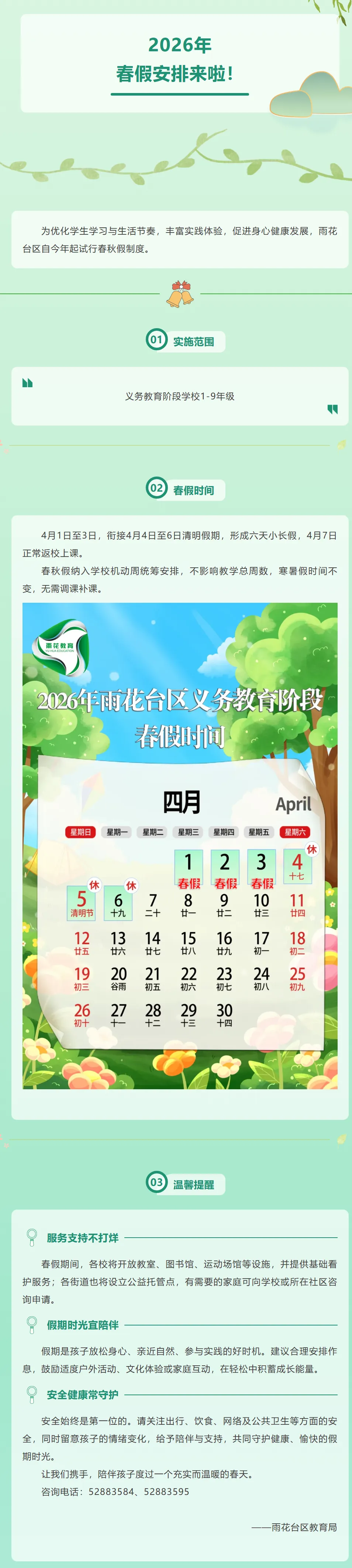 春假让孩子们回归自然,进行户外实践,在探索与体验中舒展身心;为家庭创造更多共享时光,鼓励亲子互动,在放松与交流中陪伴成长。春假期间,如家庭看护确有困难,学校提供免费托管服务,保障学生安全。