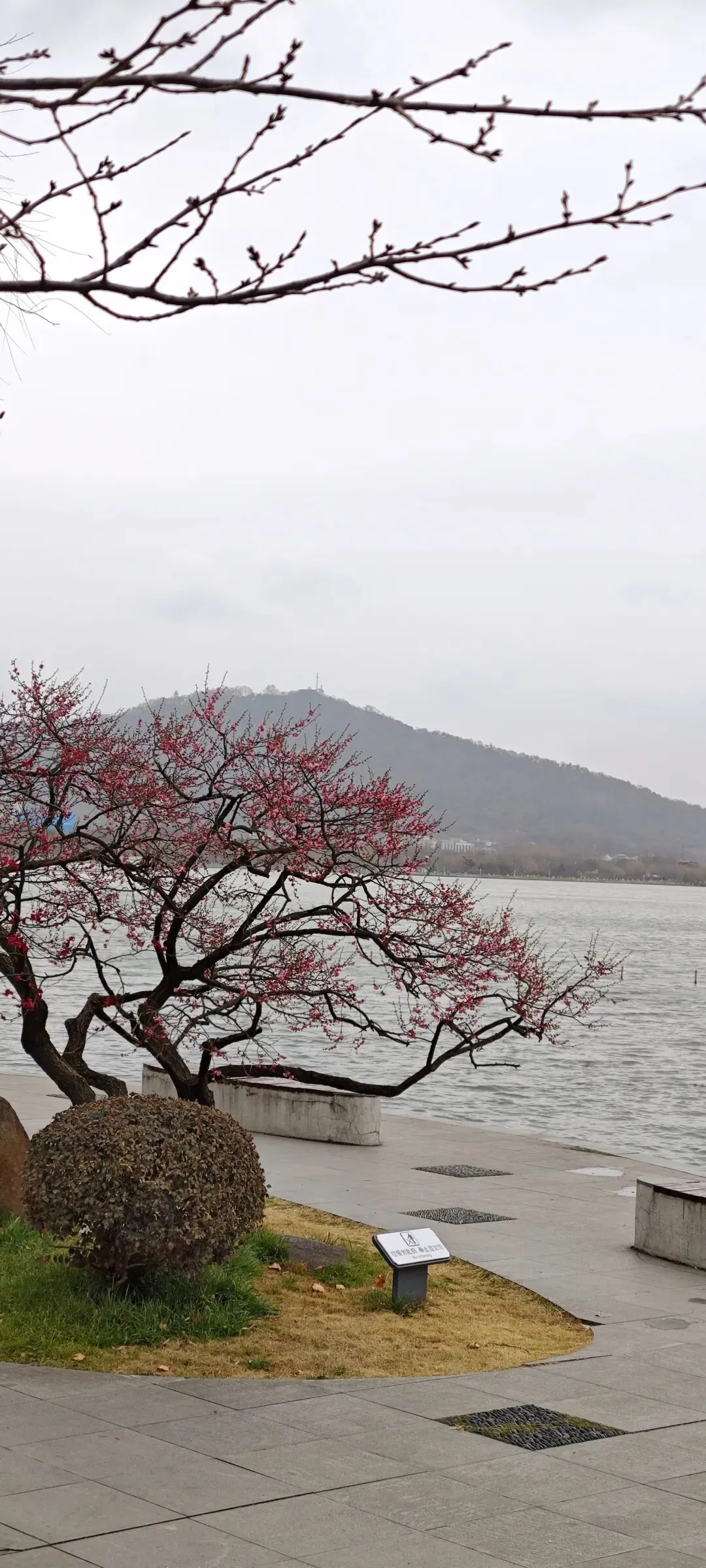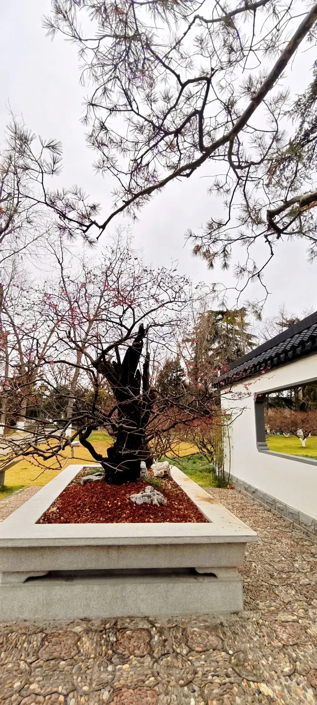 在玄武湖梁洲,寻寻觅觅找到明朝古梅。名牌介绍说:“亭东古梅树,托根王砌台。云霞连独秀,迥不染尘埃。馨香满空庭,仙侣时徘徊。这首诗是嘉靖十四年(1535年)进士、曾任南京户部主事的廖世魁所写,天语亭(圣谕亭)在郭璞墩之上。‘古梅一树雪精神’,这株明梅至今已有600多年历史,是玄武湖的梅王,其苍劲嶙峋,枯而不死;花重瓣,极香,亦属梅中珍品,历经风吹雨打,至今仍岁岁作花。”这是怎样的生命力,怎样的守口如瓶只为花开,蕴藉之美令人震撼!