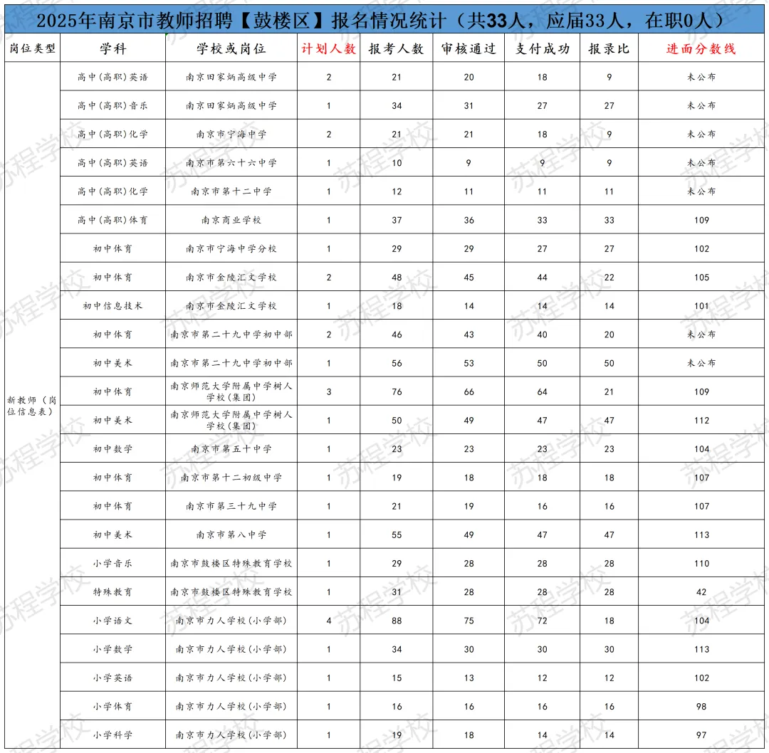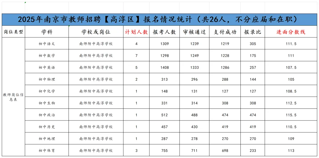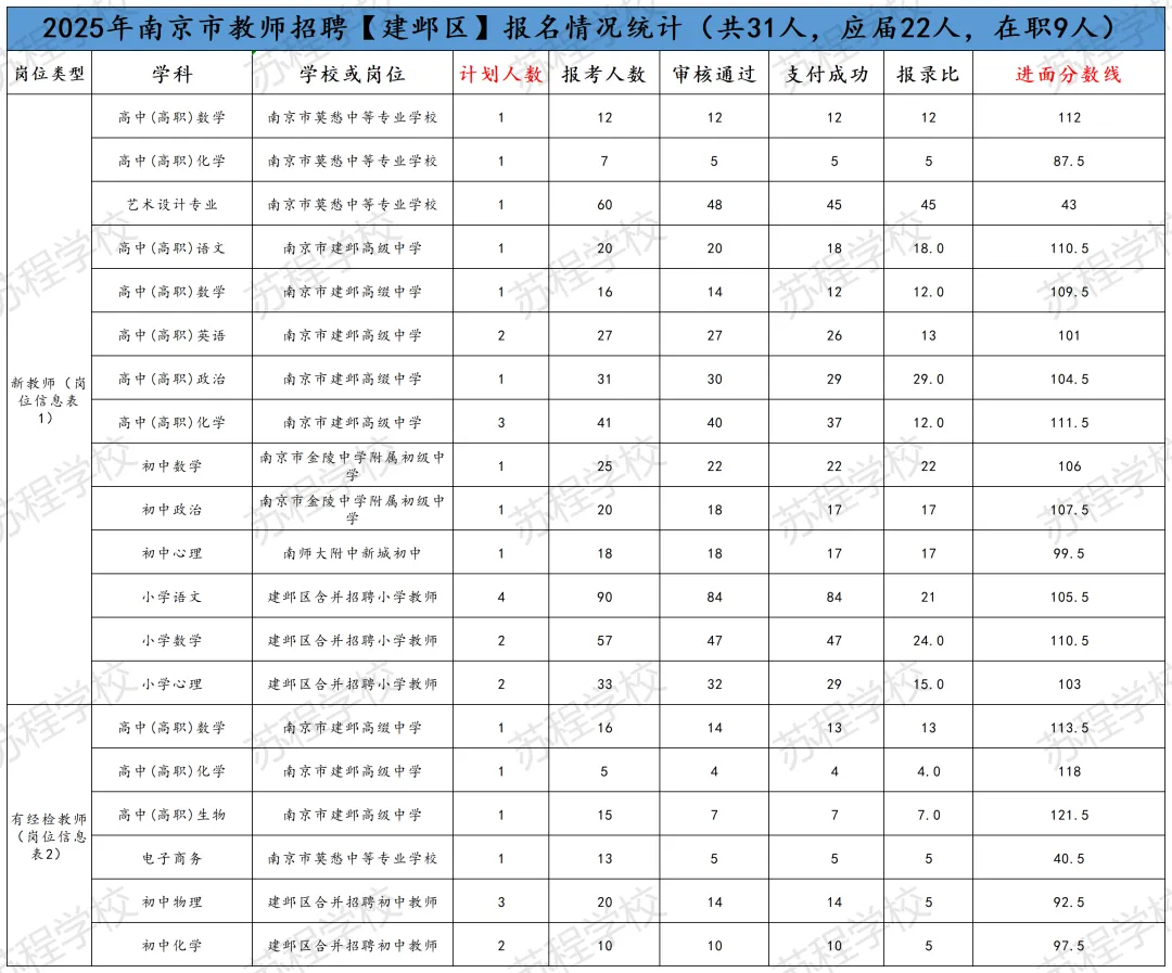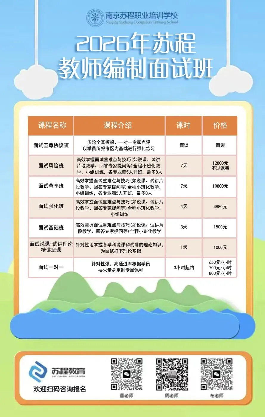 南京教师招聘笔试已结束,11号即将出笔试成绩!年前基本不会面试,但大家不要放松,利用春节假期,高效备考,不打无准备之战!原因有下:1.2026年教师分区进行笔试和面试,大家都只有一次机会,只许成功,不可失败!2.依据往年各区面试时间的安排,江北新区和玄武区很有可能初九就发布面试公告,元宵节前结束面试考核!其他区也有这种可能! 面试在整个的教师招聘考试成绩中占比高达70%,显得尤为重要!而面试较之于笔试,更考验大家的语言表达能力,试讲或说课能力等,跟笔试考核能力相差巨大!所以大家一定要尽早准备! 首先大家可以备好自己所报年段和所报学科的南京现行正在用的教材; 其次要系统地梳理每课教学的目标与重难点,以及教学过程的设计等; 最后,要进行大量的训练,但是要是有方法和点评的训练,这样才能事倍功半! 如果您在备考过程中,有任何问题,都可以向我们求助,苏程可以提供最适合您的课程和一线最权威的师资! 如果大家担心自己的分数能否进面,可以参照25年的各区各专科的面试线。如下: PS:小编在这要提醒大家,这个进面分数线只能做参考,因为今年的报考正常和去年有着非常大的差异,但早点准备起来一定是王道!“心动不如行动,加入我们吧