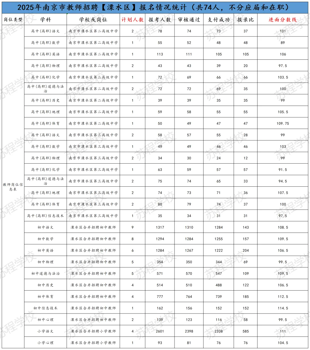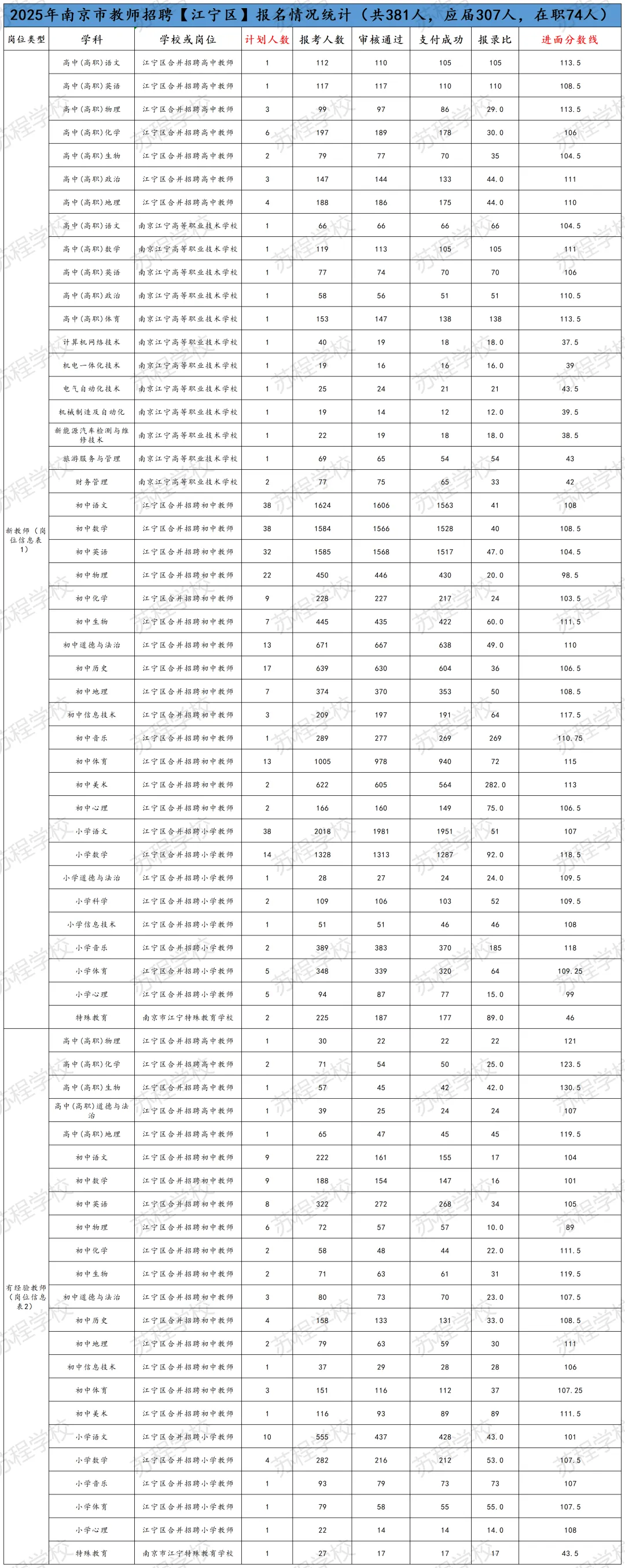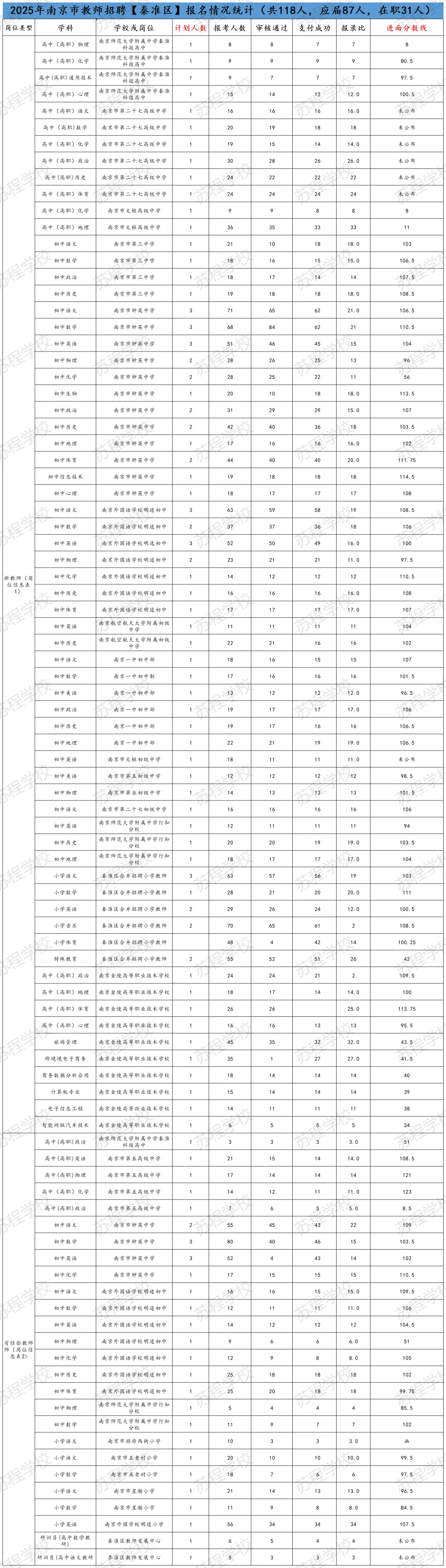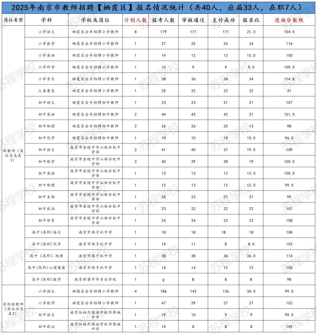 南京教师招聘笔试已结束,11号即将出笔试成绩!年前基本不会面试,但大家不要放松,利用春节假期,高效备考,不打无准备之战!原因有下:1.2026年教师分区进行笔试和面试,大家都只有一次机会,只许成功,不可失败!2.依据往年各区面试时间的安排,江北新区和玄武区很有可能初九就发布面试公告,元宵节前结束面试考核!其他区也有这种可能! 面试在整个的教师招聘考试成绩中占比高达70%,显得尤为重要!而面试较之于笔试,更考验大家的语言表达能力,试讲或说课能力等,跟笔试考核能力相差巨大!所以大家一定要尽早准备! 首先大家可以备好自己所报年段和所报学科的南京现行正在用的教材; 其次要系统地梳理每课教学的目标与重难点,以及教学过程的设计等; 最后,要进行大量的训练,但是要是有方法和点评的训练,这样才能事倍功半! 如果您在备考过程中,有任何问题,都可以向我们求助,苏程可以提供最适合您的课程和一线最权威的师资! 如果大家担心自己的分数能否进面,可以参照25年的各区各专科的面试线。如下: PS:小编在这要提醒大家,这个进面分数线只能做参考,因为今年的报考正常和去年有着非常大的差异,但早点准备起来一定是王道!“心动不如行动,加入我们吧