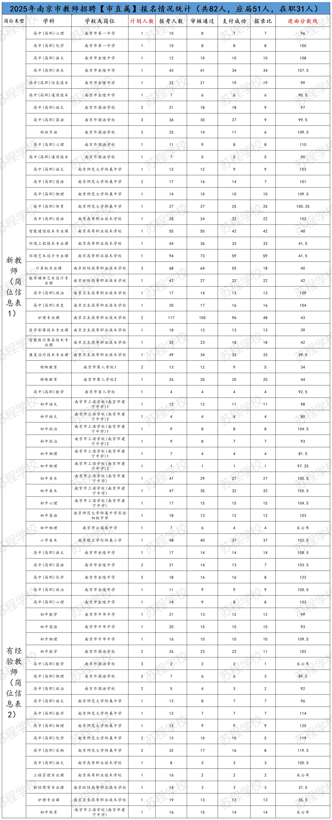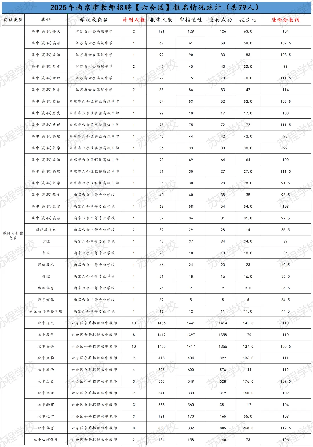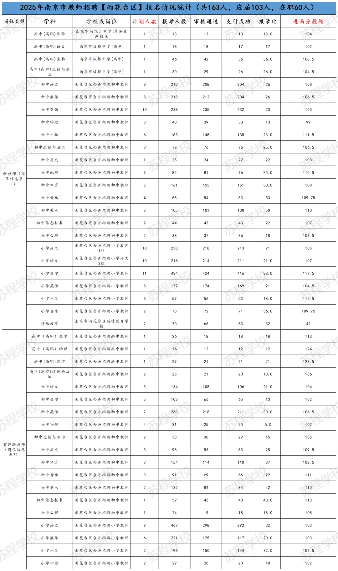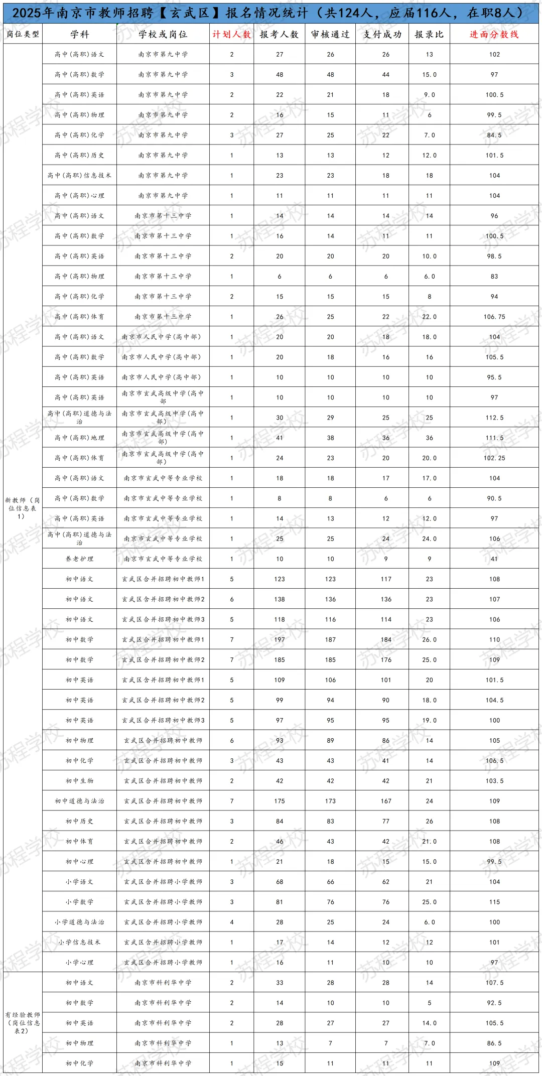 南京教师招聘笔试已结束,11号即将出笔试成绩!年前基本不会面试,但大家不要放松,利用春节假期,高效备考,不打无准备之战!原因有下:1.2026年教师分区进行笔试和面试,大家都只有一次机会,只许成功,不可失败!2.依据往年各区面试时间的安排,江北新区和玄武区很有可能初九就发布面试公告,元宵节前结束面试考核!其他区也有这种可能! 面试在整个的教师招聘考试成绩中占比高达70%,显得尤为重要!而面试较之于笔试,更考验大家的语言表达能力,试讲或说课能力等,跟笔试考核能力相差巨大!所以大家一定要尽早准备! 首先大家可以备好自己所报年段和所报学科的南京现行正在用的教材; 其次要系统地梳理每课教学的目标与重难点,以及教学过程的设计等; 最后,要进行大量的训练,但是要是有方法和点评的训练,这样才能事倍功半! 如果您在备考过程中,有任何问题,都可以向我们求助,苏程可以提供最适合您的课程和一线最权威的师资! 如果大家担心自己的分数能否进面,可以参照25年的各区各专科的面试线。如下: PS:小编在这要提醒大家,这个进面分数线只能做参考,因为今年的报考正常和去年有着非常大的差异,但早点准备起来一定是王道!“心动不如行动,加入我们吧