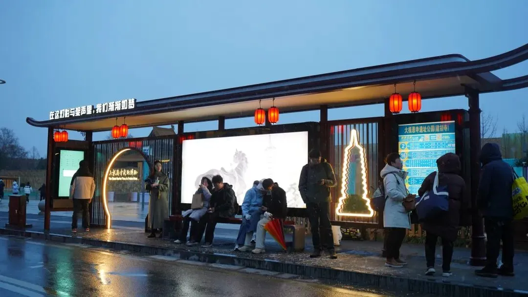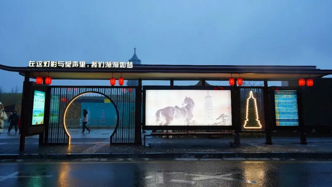 在满足候车功能的基础上,这座站台更像是一座微型文化展厅。中央灯箱以 “马踏飞燕” 结合琉璃塔剪影的艺术画面,诉说着南京作为六朝古都的文脉传承;西侧的镂空格栅融入 “报恩纹” 等传统纹样,光影交错间为匆忙的都市人营造出一方诗意的停留空间。