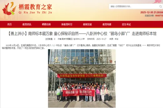 南京市栖霞区教育局官方网站“栖霞教育之家”多次发布新闻,报道区内多所中小学走进博物馆开展“知行”校外实践活动;植树节期间,龙潭中心小学的同学们在馆内通过“刺猬与蛇”等鲜活标本探索生态智慧;八卦洲中心小学的学生则在讲解员引领下,完成了一场从白鱀豚到中华鲟的自然奥秘之旅。相关报道进一步彰显了博物馆作为“栖霞‘知行’校外社会实践基地”与“江苏省青少年科技教育示范基地”的育人功能。