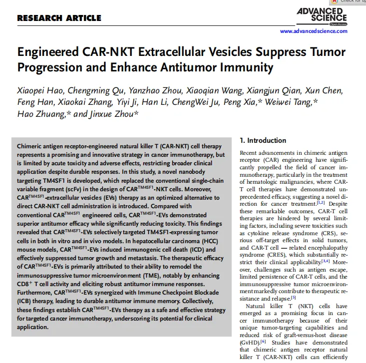 肝细胞癌(HCC)作为全球高死亡率的恶性肿瘤之一,传统治疗手段疗效有限,且 CAR-T 等细胞免疫疗法面临细胞因子释放综合征、脱靶效应等严重副作用。郑州大学、南京医科大学等团队在《Advanced Science》发表的最新研究,开发出靶向TM4SF1的纳米抗体修饰 CAR-NKT 细胞外囊泡(CAR⁴SF¹-EVs)。该疗法不仅能精准杀伤肿瘤细胞、重塑肿瘤免疫微环境,还能与免疫检查点抑制剂协同作用,诱导长效抗肿瘤免疫记忆,为实体瘤治疗提供了兼具安全性与有效性的全新策略。