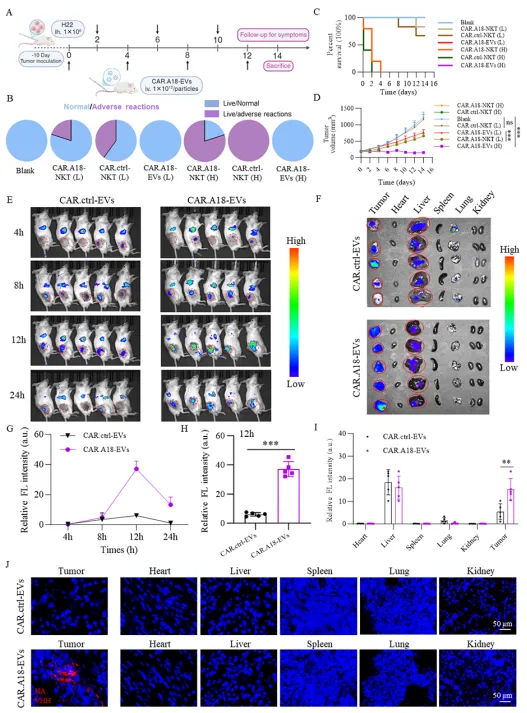 安全性:高剂量 CAR-NKT 细胞注射导致小鼠 14 天内 100% 死亡,而高低剂量 CAR⁴SF¹-EVs 组均无小鼠死亡或明显不良反应,血常规和组织病理检测显示各器官无异常。