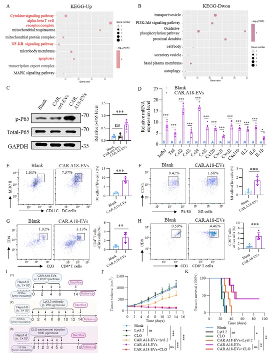RNA 测序结果显示,CAR⁴SF¹-EVs 处理后,肿瘤组织中细胞因子信号通路、NF-κB 通路显著激活,促炎细胞因子(TNF-α、IFN-γ)和趋化因子表达上调。
