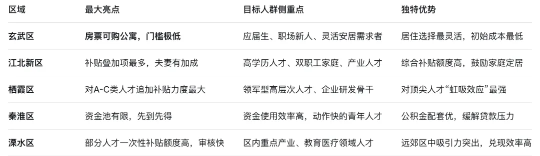 玄武区以“范围创新”破局,其他区域则各自在补贴力度、目标人群和配套政策上深耕,形成了百花齐放的竞争格局: