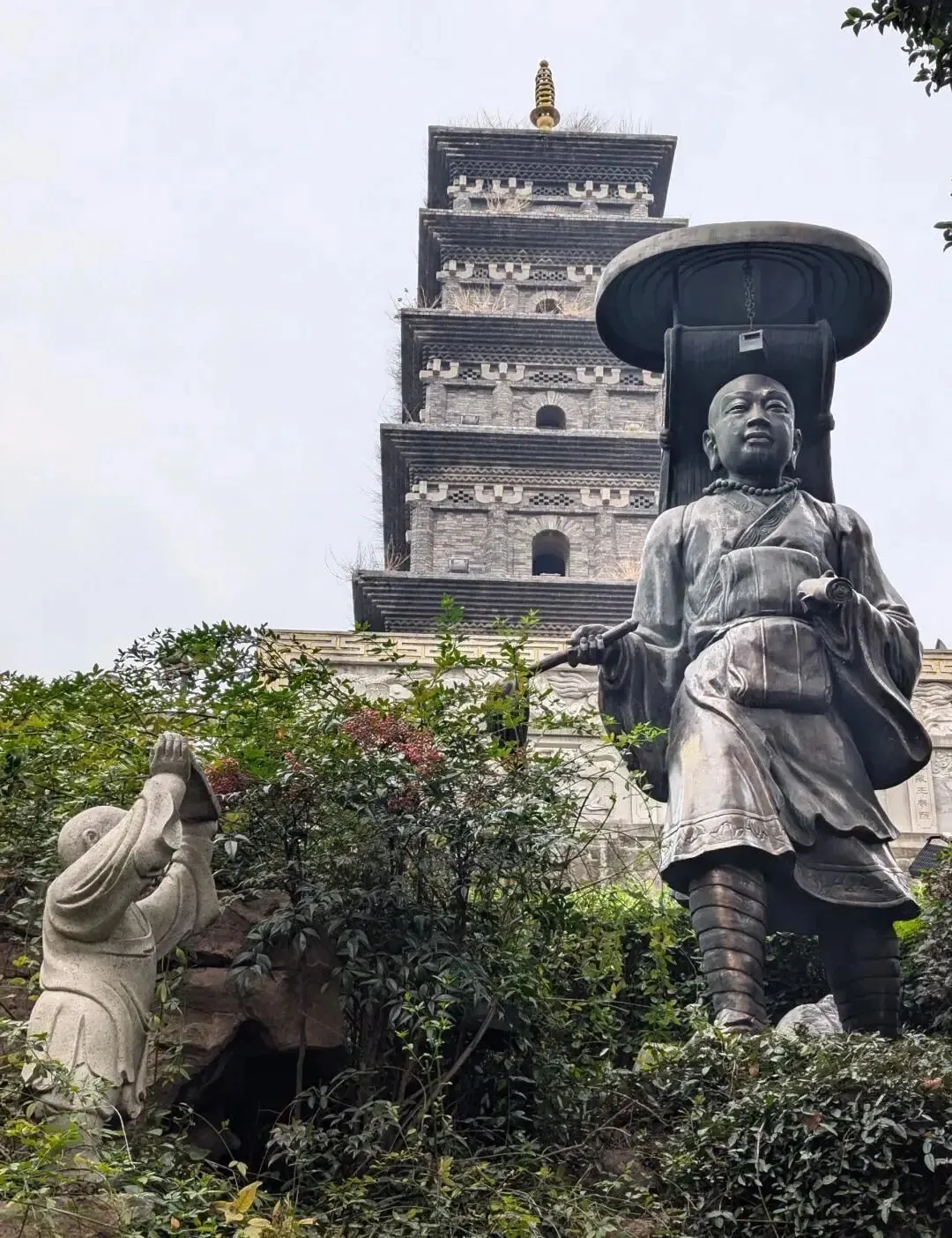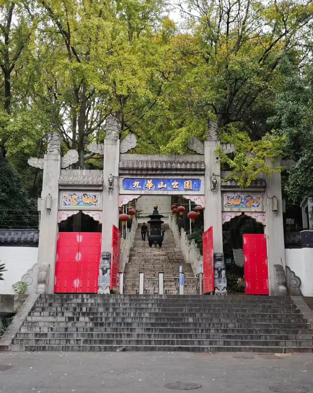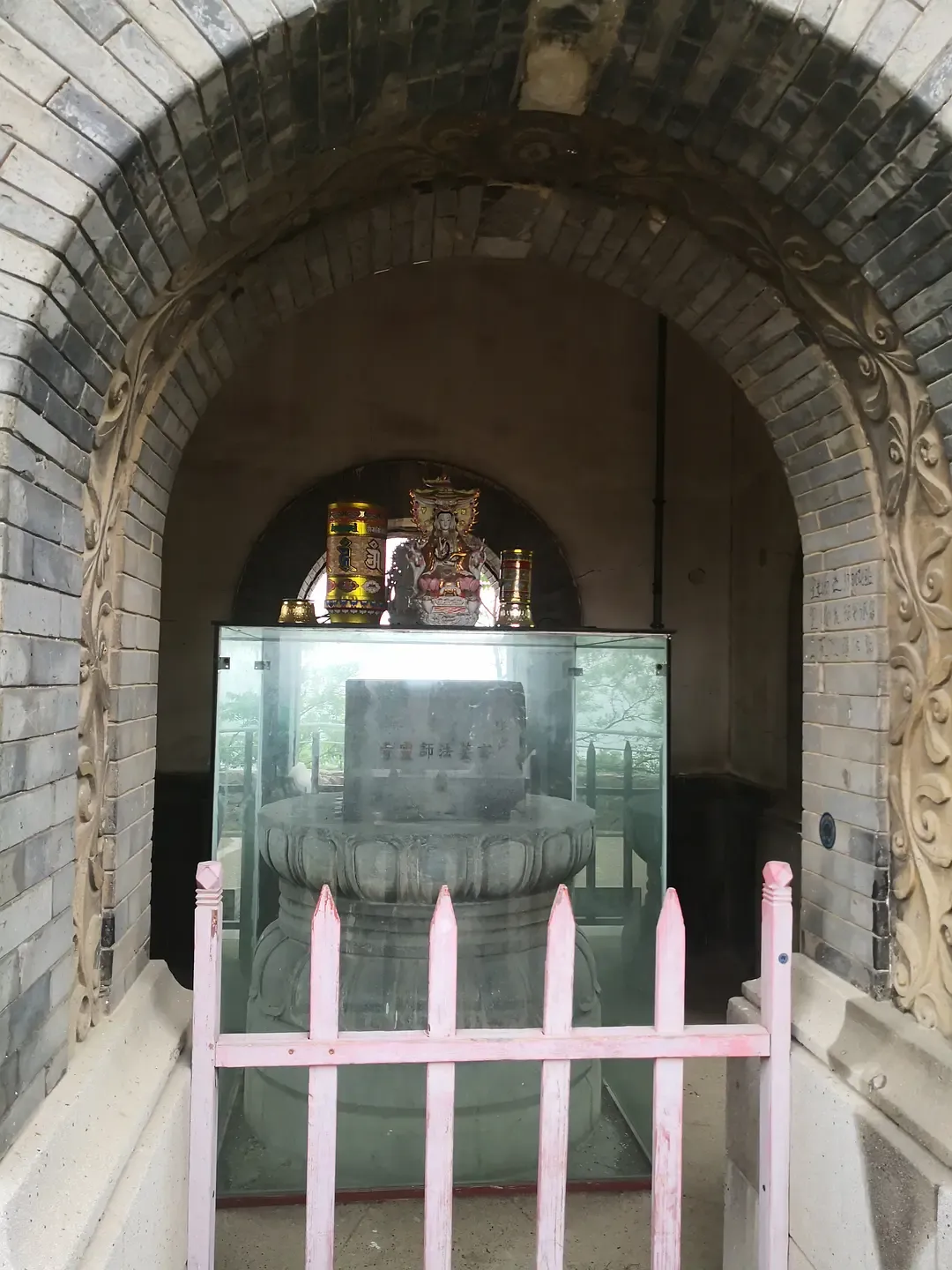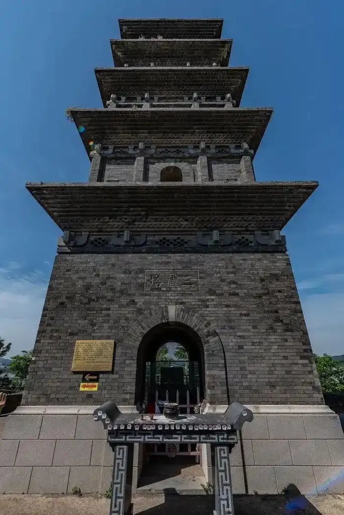 九华山在南朝时寺观园林盛极一时,建有龙光寺、法轮寺、甘露亭等建筑。然历经变迁,至近代已日渐凋零,“楼台荒废难留客,林木飘零不禁樵”,唯存三藏塔等少数遗构,三藏塔为五级方形楼阁式砖塔,建于民国时期,仿唐代长安兴教寺玄奘墓塔形制。塔身每层设四门,底层拱门内嵌小碑,刻“玄奘法师灵骨”六字,塔基青石刻有玄奘像及西行路线图,直径1.45米。