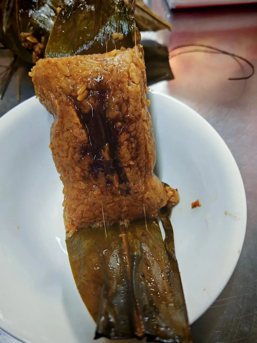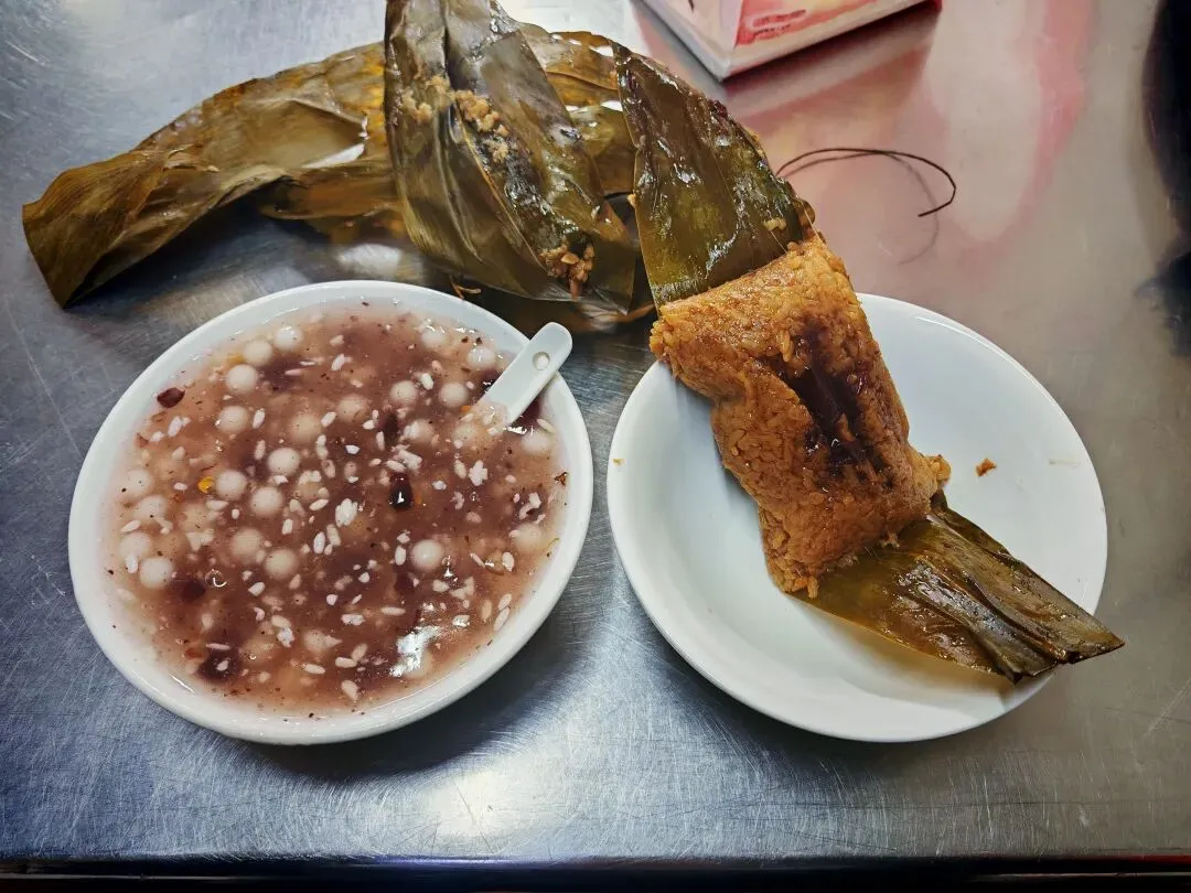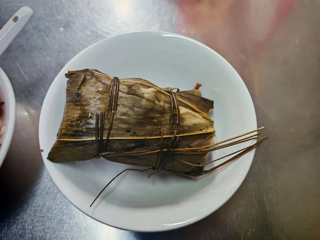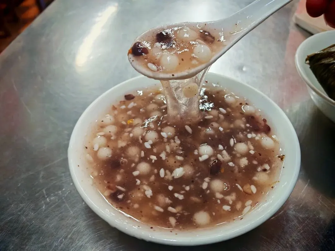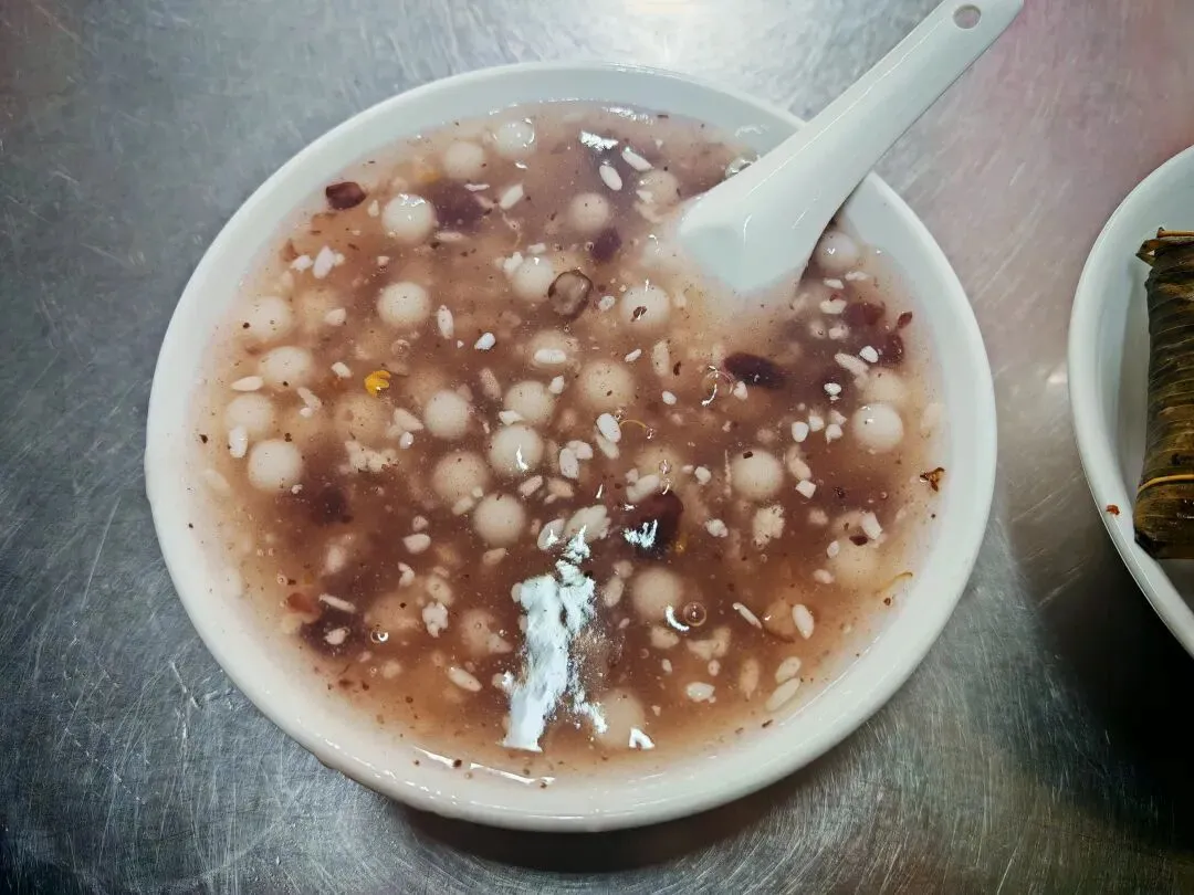 要打包带走就在外面付款结账,如果进店里吃就拐过去排队结账。 这家店做的很有名的乌饭油条没有了,因为是早上开始卖的,卖完就没有了,杂粮饭也是只有早上才有。先点了一碗酒酿赤豆元宵,然后偶尔吃一下“反季节”的粽子也不错,就要了一个豆沙粽。 里面红豆并不是很多,没什么红豆味。而且这个汤就是那种典型的加藕粉加的很多的了。我有点不是很喜欢这种赤豆元宵。 粽子相当诱人,而且豆沙粽这个豆沙馅特别好吃,是那种标准的豆沙粽的味道。 店外面经常有人来要5个10个粽子打包带走的,我也又打包了一个豆沙粽和一个肉粽(刚刚还没看见肉粽呢,要是看见的话,我就堂食再加一个了)。