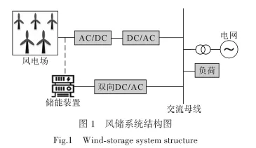 研究的风储系统主要由风电场、用于频率调节的储能装置、功率变流器以及负荷构成,如图1所示。系统采用双向DC/AC 变流器控制储能装置充放电,将风电场发出的有功功率和蓄电池组内蓄电池的充电功率经双向DC/AC变流器控制并接入交流电网。
