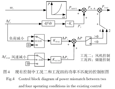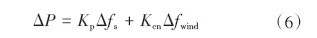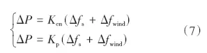 针对工况二与工况四要进行功率比较时存在系数不一致导致补充的功率缺额过多,以及工况切换不准确的问题,本文为储能设置与风机匹配的自适应下垂系数Kcn,即让风机的下垂控制系数与储能的下垂系数保持一致,即Kcn=Kp。这样在进行功率比较时,避免出现因为系数不同而导致储能或者风机多出力造成过度弥补功率缺额以及切换不准确的情况,改进后的功率指令如下式所示: