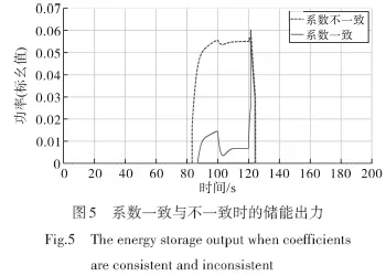 图5、图6表明,当系数不一致时,储能出力和频率偏差均明显增大,造成系统过度调频 。