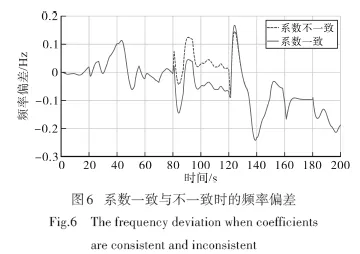 由图5可知,当使用的系数不一致时,出力明显增多,即计算得到的ΔP 不准确,弥补的功率缺额过多,导致频率偏差增大,其频率偏差对比如图6所示。