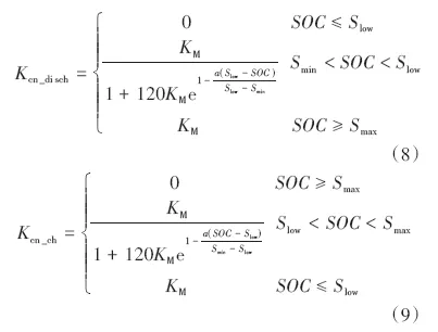 当储能SOC 偏高时,把储能放电系数设置为最大值,使电池SOC 减缓达到上限的速度,同理,当储能SOC 偏低时,把储能充电系数设置为最大值,使电池SOC 能更快恢复,随着SOC 增大充电系数随之减小[18]。将SOC 划分为三个区域,设定下限Smin为0.1,适中值也是初始值Slow为0.5,上限Smax为0.9。